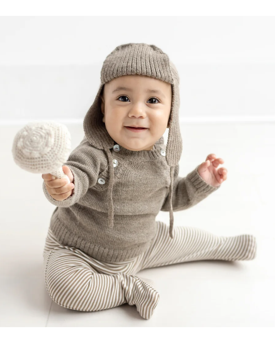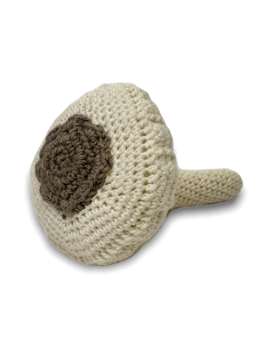 This hand crochet butter cap mushroom rattle sits at 5" tall. Playfully shaped with a whimsical sound for the sweetest plush toy. Spot these enchanted fungi and be entertained all day long!
