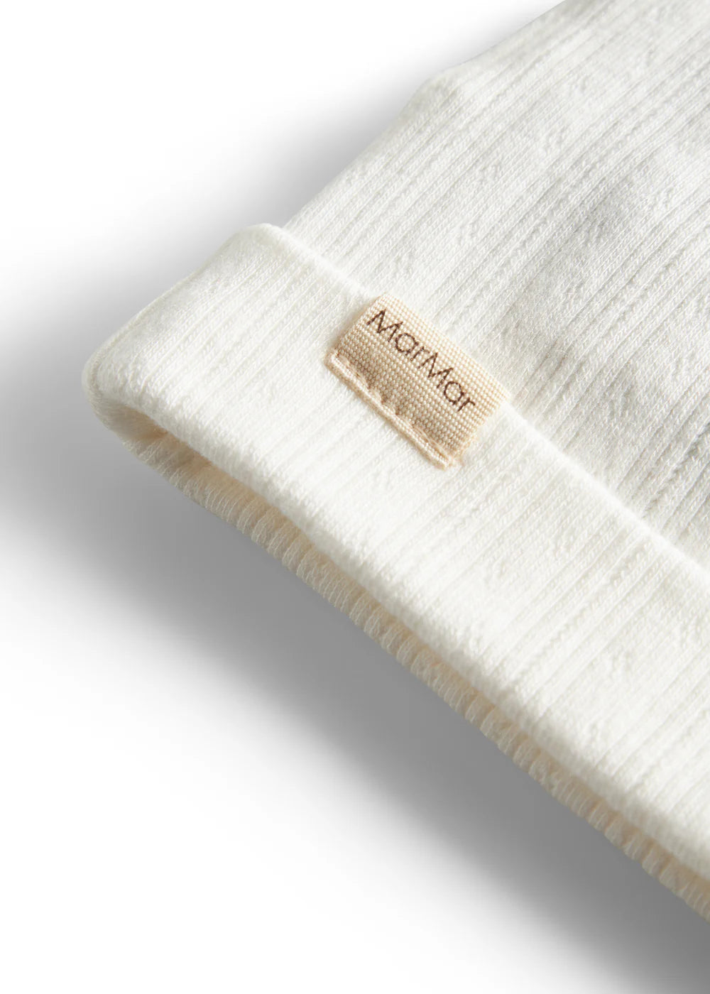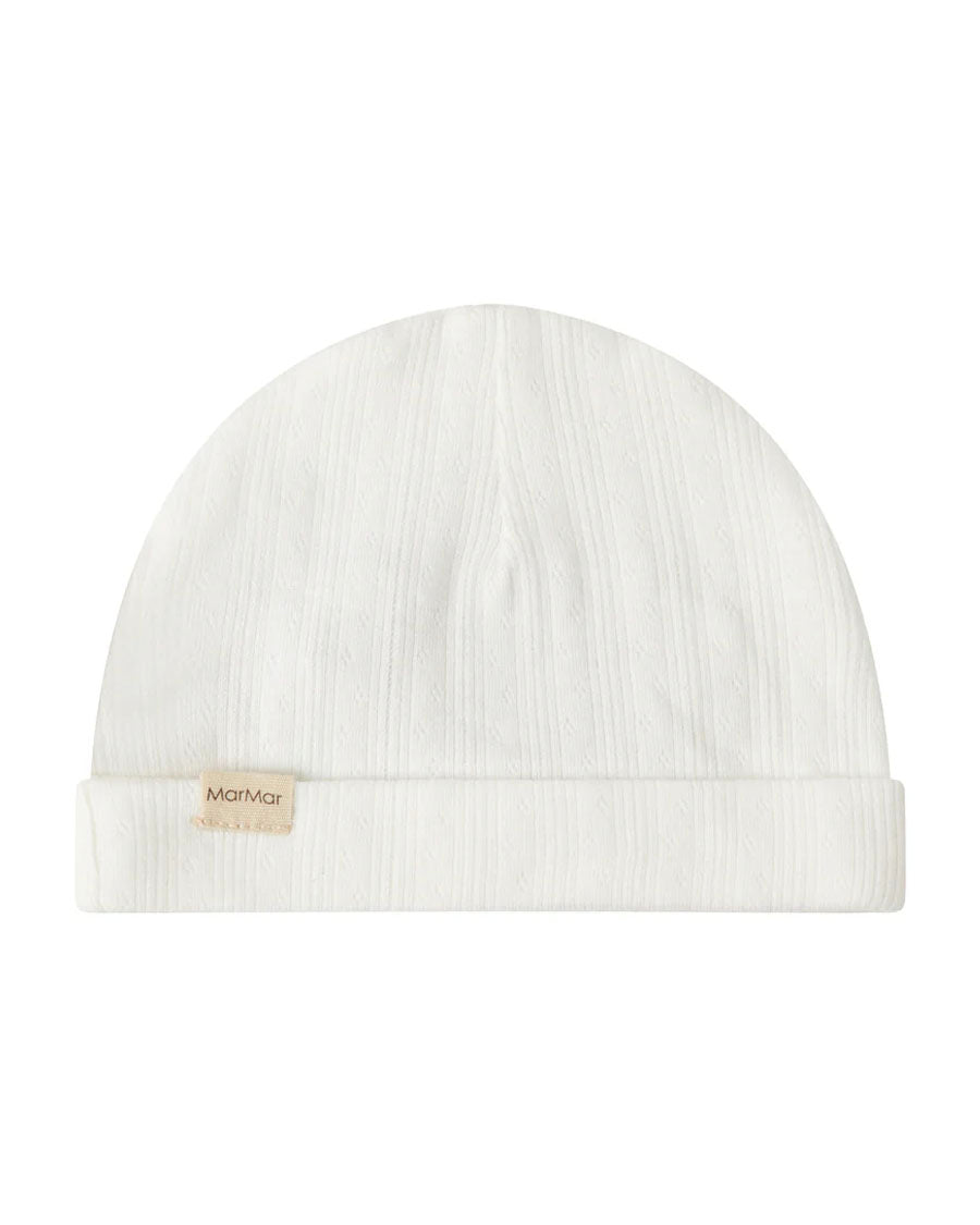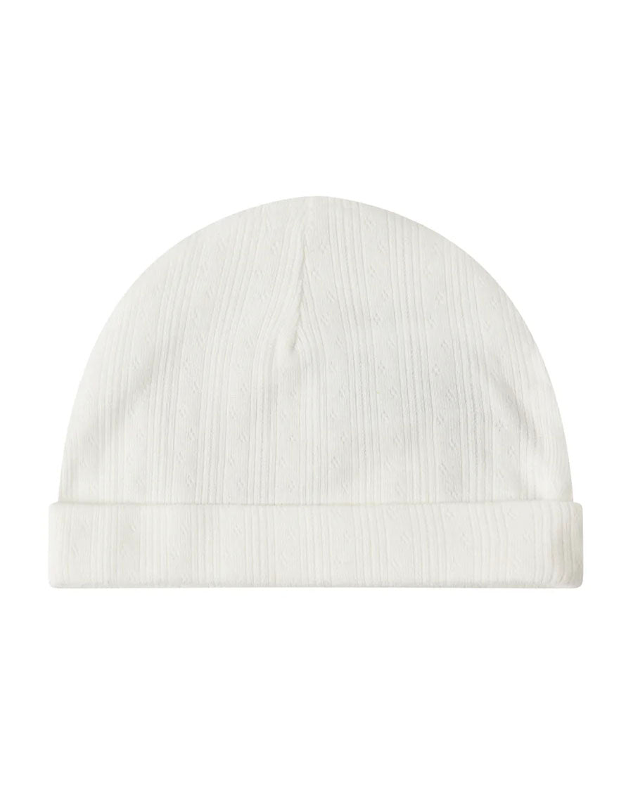 Small pointelle hat for newborns with a brim that can be folded up or down. The hat is soft, stretchy and comfortable to wear.