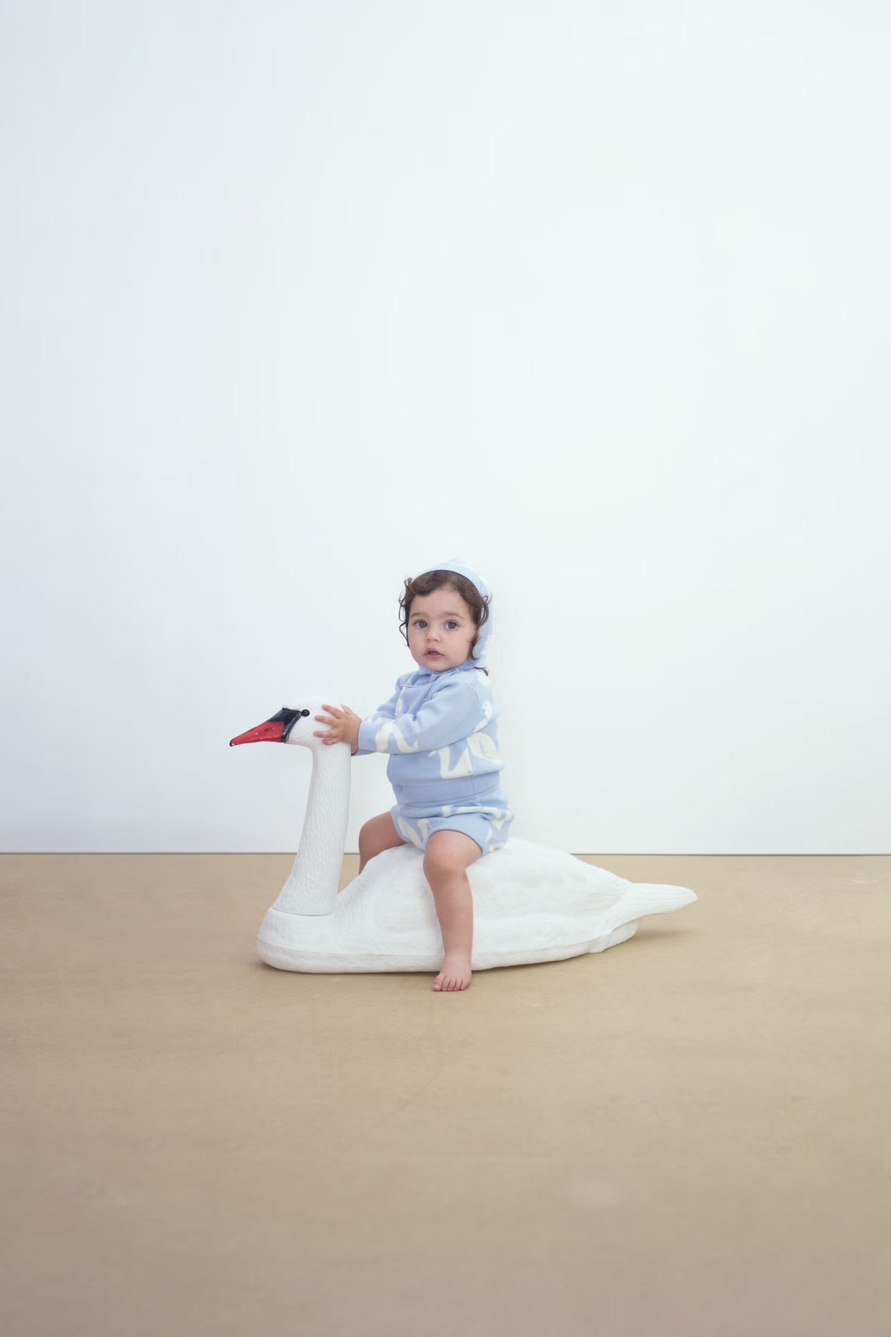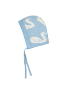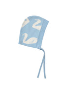 This knit bonnet, featuring a Big Swans jacquard pattern on a washed blue base and made from 100% cotton, has a ribbed trim at the front for a clean finish. Its versatile design provides warmth and a subtle touch of style, effortlessly pairing with any winter outfit.