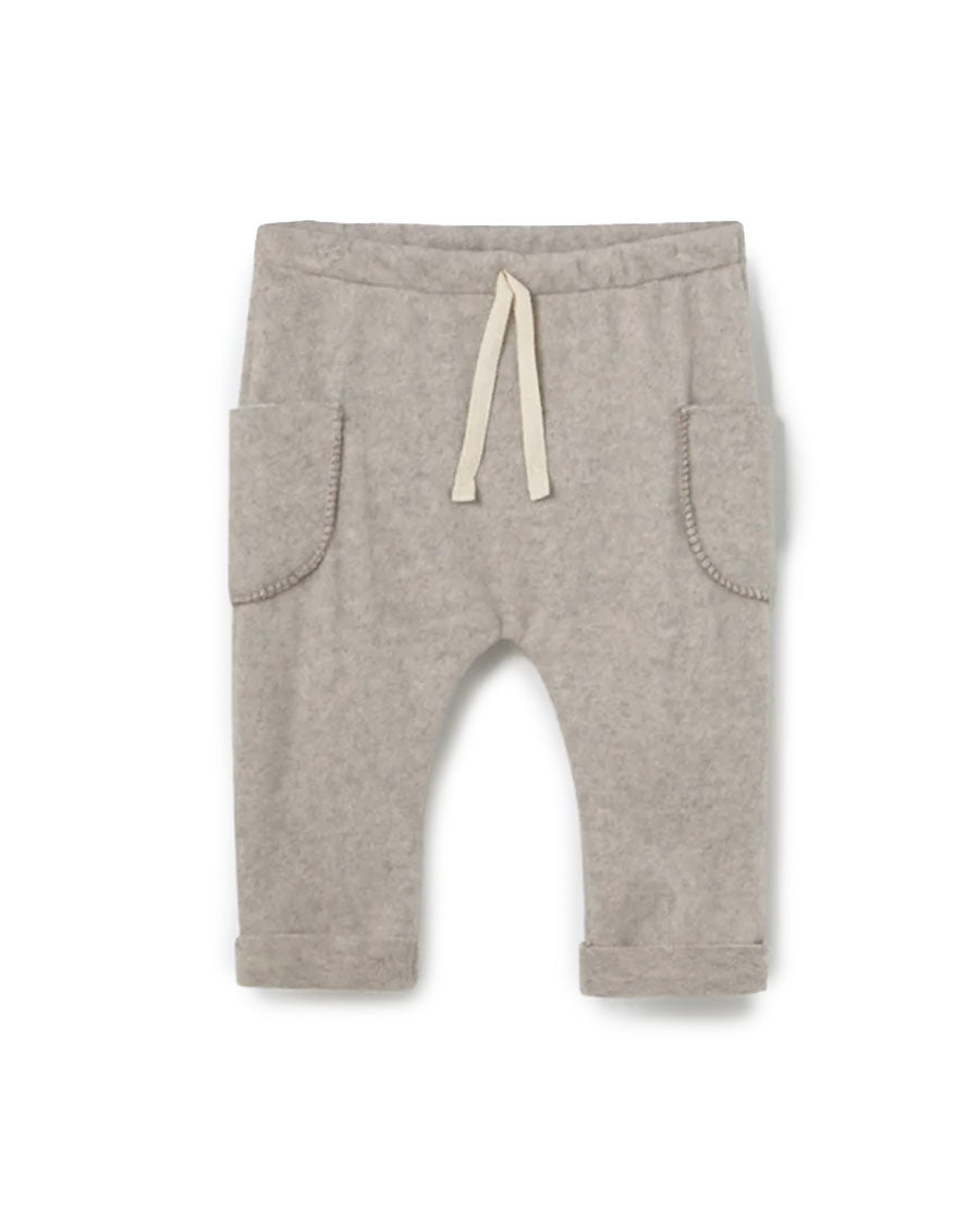 Part of our bamboo baby clothes collection, these pants are made from tender bamboo fabric with a soft mélange effect. Designed for comfort and flexibility, they feature an elastic waistband with a decorative drawstring, side patch pockets, and rolled-up hems—ideal for everyday wear.