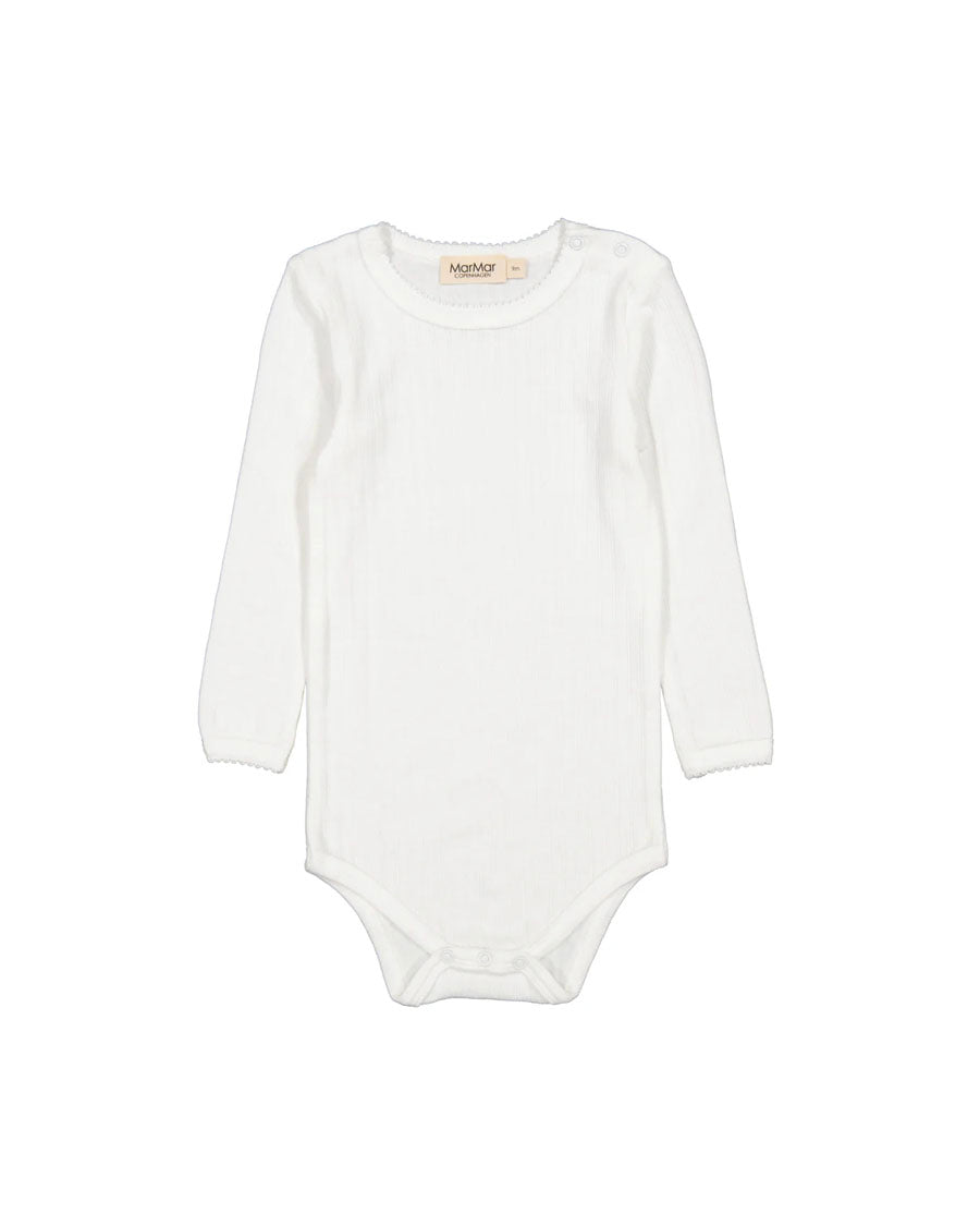 Simple pointelle long-sleeved baby bodystocking that closes with snaps on the left shoulder and between the legs for easy diaper changes. The bodystocking is soft, stretchy and comfortable to wear.