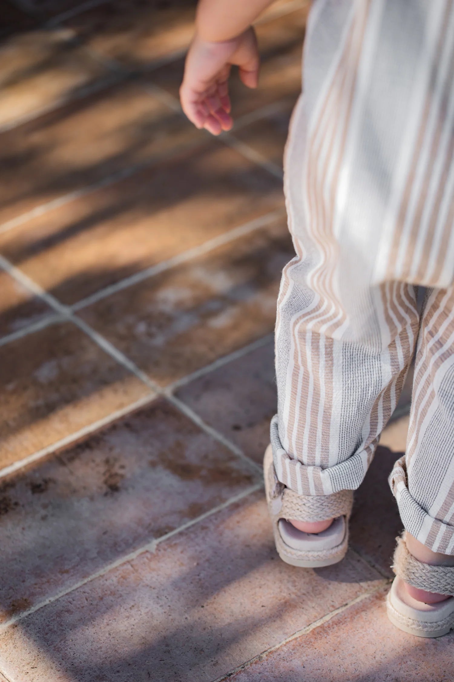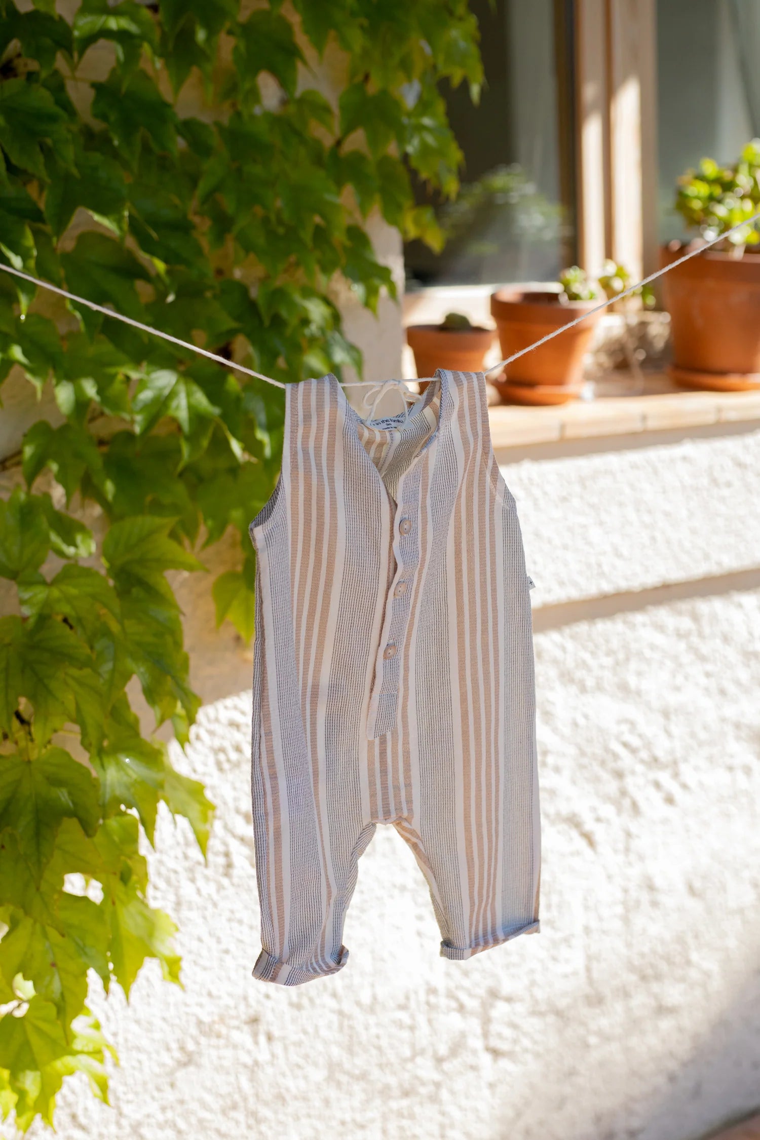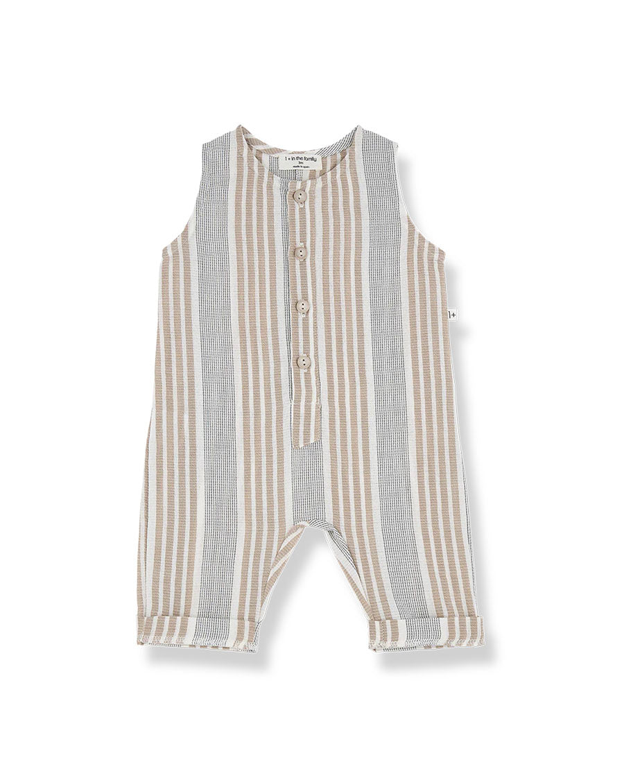Gauzy summer romper. Features tank sleeves, button front closure, back pocket, allover stripes in a loose fit.