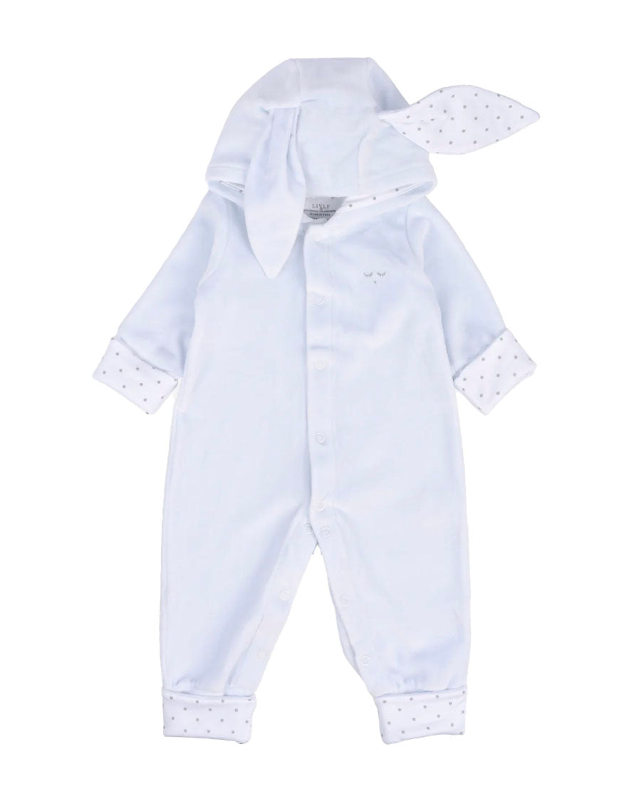 Plush bunny overall features a soft cotton blend that‚ cozy and comfy enough for all day wear. Featuring silver grey with silver Saturday dot design on sleeve and ankle cuffs, convenient snap closures down to the ankle and bunny ears hoodie for added cuteness! Makes a cute gift for baby showers and baby registries.