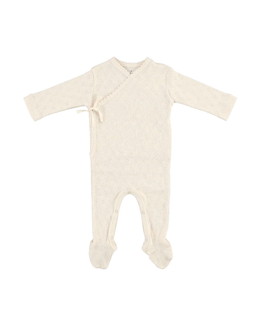Bebe wrap overall in the softest organic cotton pointelle features a wrap opening, long sleeves, covered toes, and snaps for an easy change. This overall is the ultimate item for all babies and more especially for newborns. Match it with a Bebe Heart bonnet or Heart hat for a perfect set.