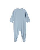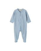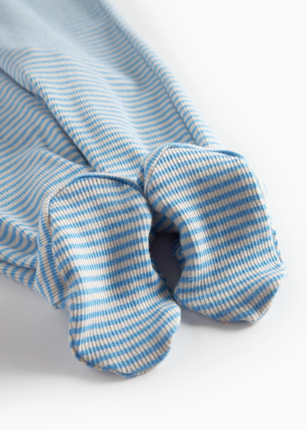 Simple long-sleeved onesie with feet and fine stripes that can be buttoned all the way from the neck down both legs with snaps for easy diaper changes. The onesie is soft, holds its shape and color and has elastane in it, which makes it stretchy and comfortable to wear.