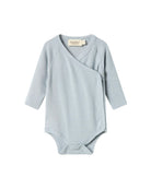 Long-sleeved bodystocking for newborns with a wrap-around closure. The bodystocking closes with snaps at the front and is incredibly soft, very stretchy and comfortable to wear.