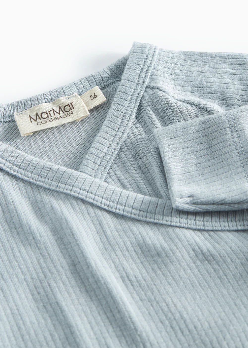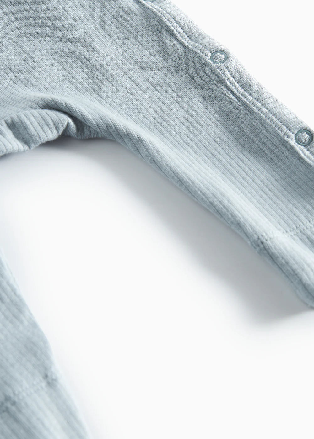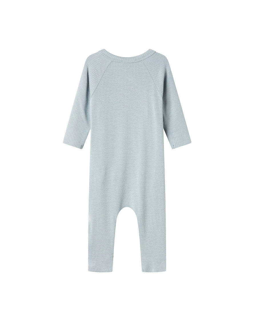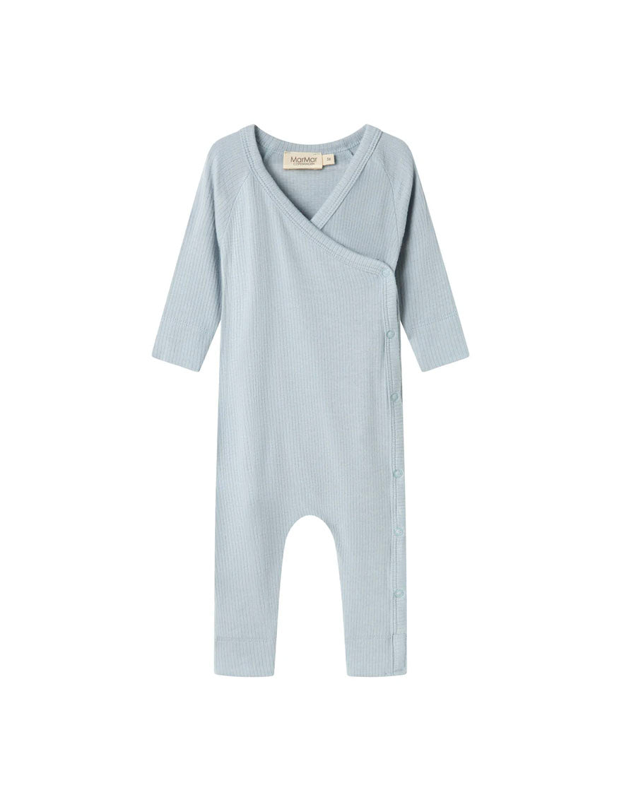 Long-sleeved jumpsuit with wrap-around closure for newborns. The jumpsuit closes with snaps from the neck and down one leg. The jumpsuit is incredibly soft, very stretchy and comfortable to wear.