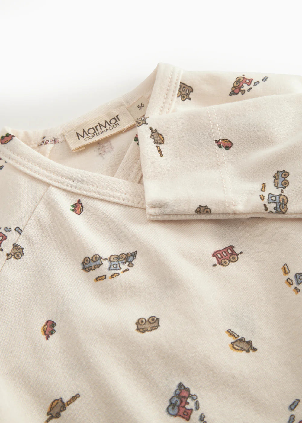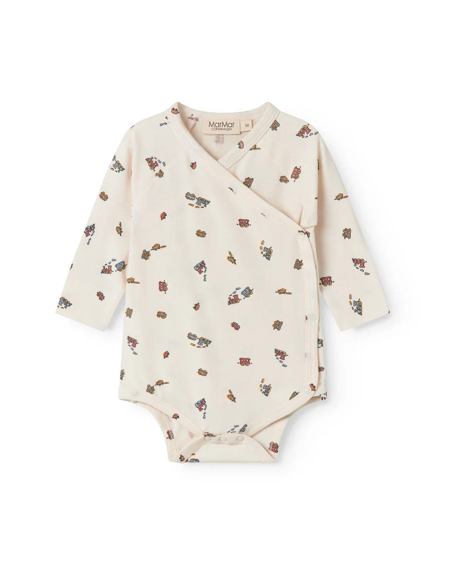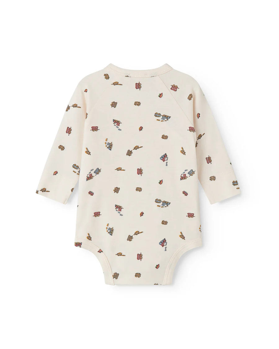 Long-sleeved bodystocking for newborns with a wrap-around closure and a cute print. The bodystocking closes with snaps and is soft, stretchy and comfortable to wear.