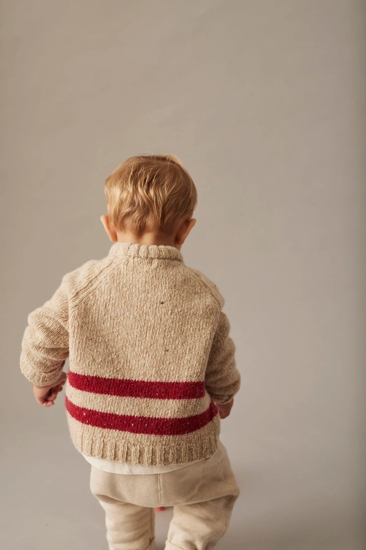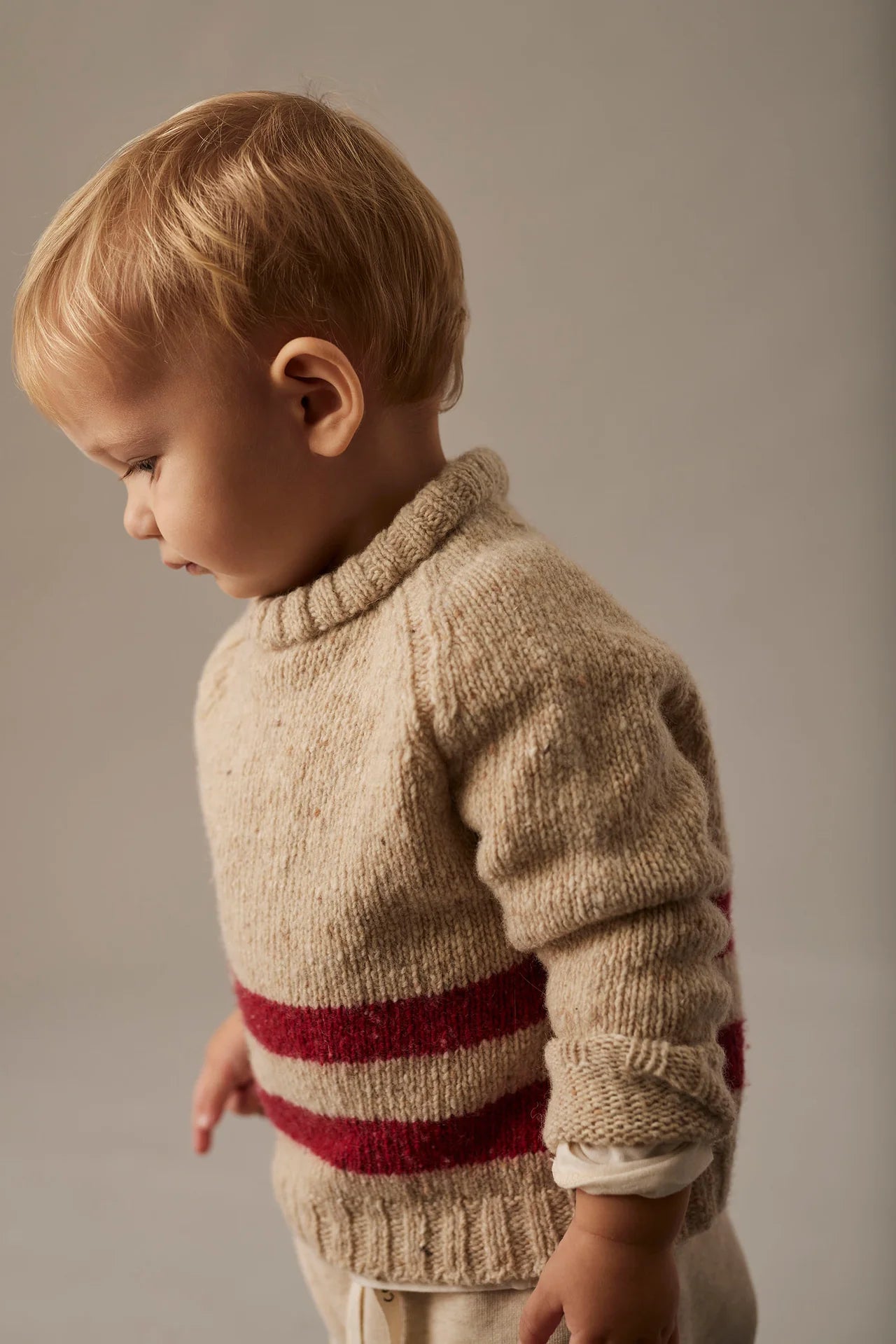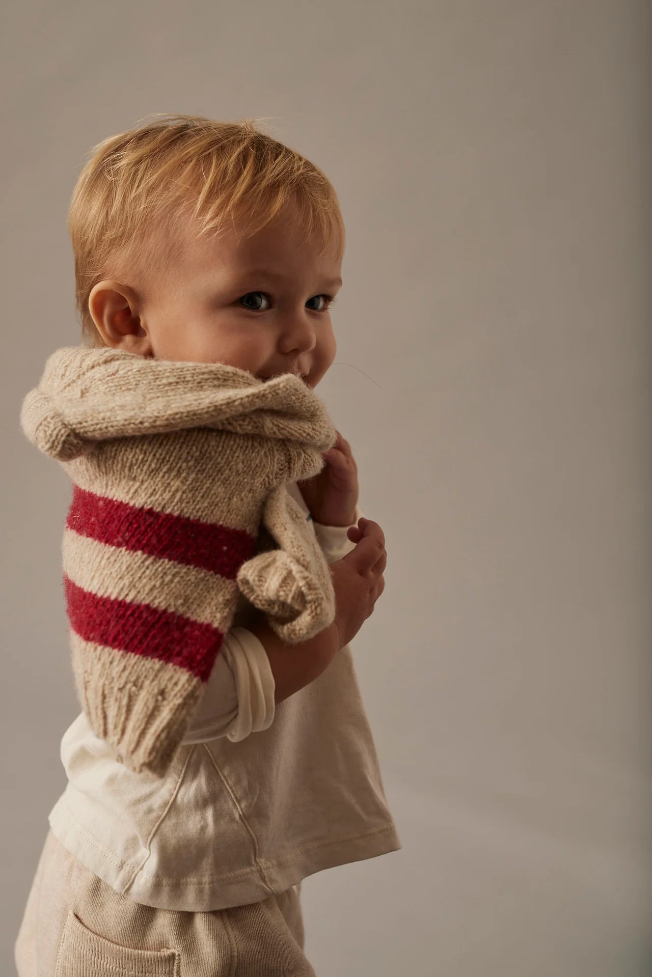 Sweater crafted from a soft, fluffy blend of wool and recycled polyamide tricot. It features ribbed neck, cuffs, and hem, raglan sleeves with cable-knit seams, and double stripes at the lower section. Subtly speckled texture for added depth. Warm and cozy, perfect for babies. Part of our recycled baby clothes collection.