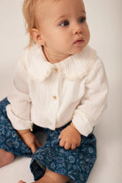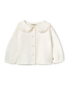 This adorable baby blouse is made from soft, pleasant, textured cotton fabric, crafted sustainably for delicate skin. It features a small double-layered collar trimmed with lace for a sweet touch. The front has a button-down placket with charming heart-shaped buttons, while long sleeves end in funnel-shaped cuffs also finished with heart-shaped buttons.
