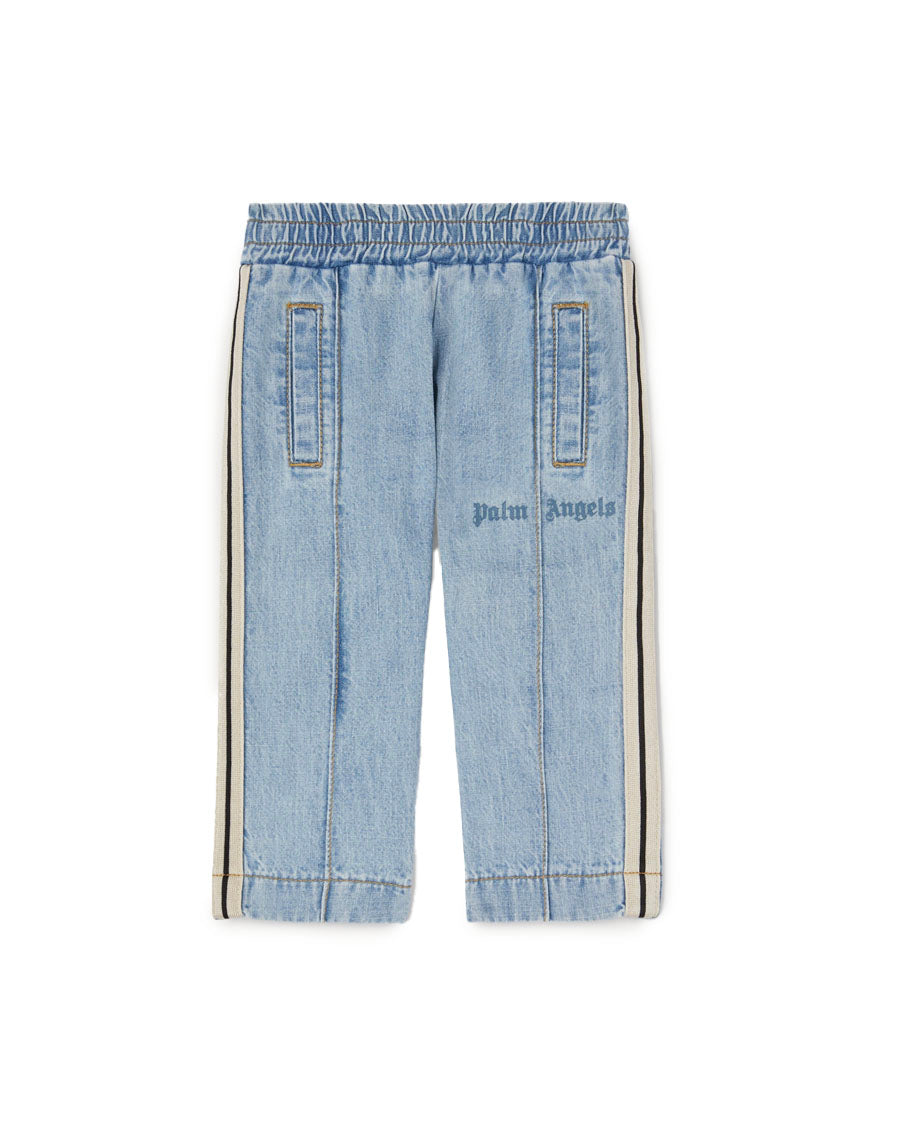 Adopt the comfort and style of the tracksuit from the very beginning. New born baby boy's denim-style chambray track pants with elastic waist and vertical pockets, iconic Tape on sides and Palm Angels logo printed in blue on front.