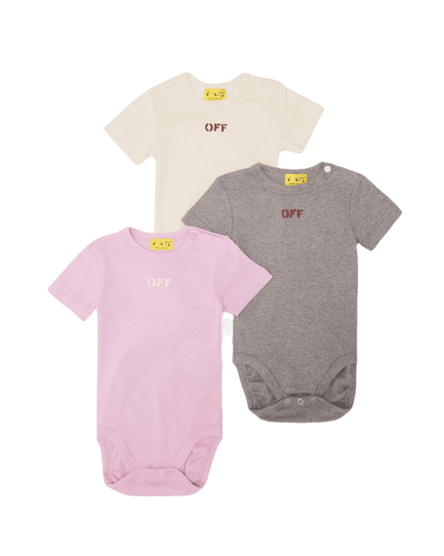 Baby girl set of 3 short-sleeve bodysuits in white, grey and pink. Bodysuits have the OFF logo at front and snap buttons for easy changing. Made by Off-White.