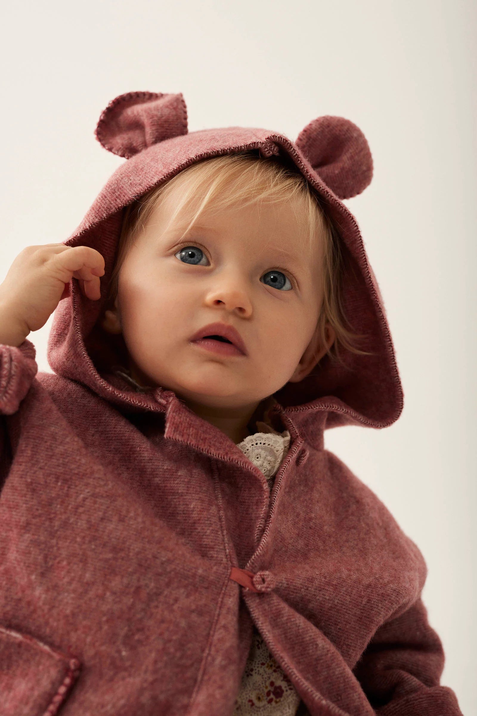 This baby coat is crafted from tender bamboo fabric with a soft mélange effect, providing natural warmth and comfort. It features bear ear appliqués on the hood, a button-loop front closure, and two patch pockets. A cozy, easy-to-layer essential for cooler days.