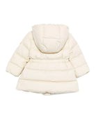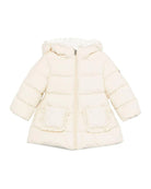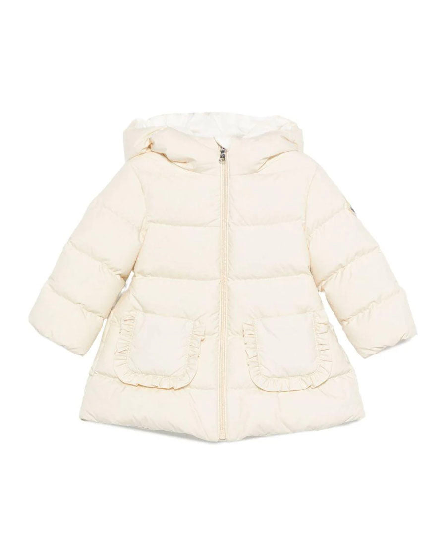 Adding a touch of whimsy to a protective style, the Molan down jacket features ruffled patch pockets. Crafted from recycled polyester, the puffer is further enhanced with soft cotton lining and a practical, enveloping hood. An elastic waistband lends a subtly flared shape, completing the design.