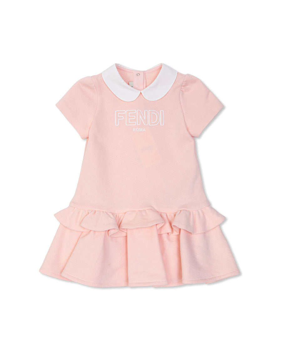 Artful, horizontal flounces adorn the lower part of the dress, offering graceful movement and a distinctly feminine allure. A prominent, intricately embroidered FENDI ROMA logo embellishes the front, signifying unmistakable luxury. Discreet back buttons provide effortless dressing, while the absence of prints preserves its refined simplicity.