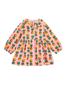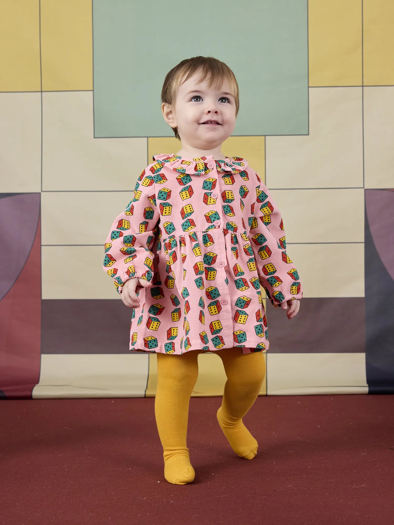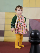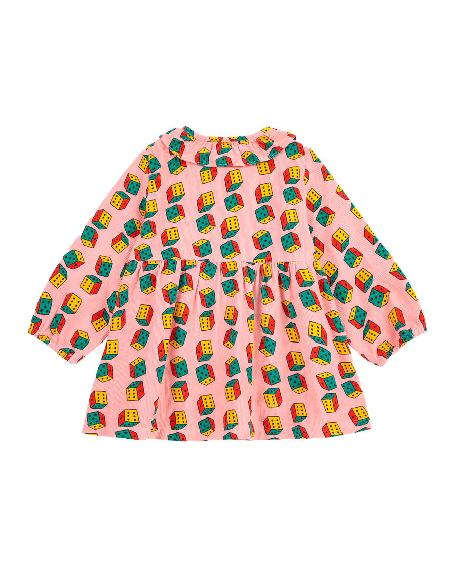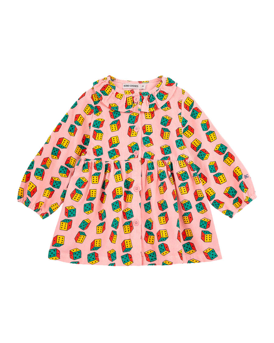 Designed with long sleeves, dropped shoulder, front button fastening, elasticated cuffs, gathering detail, embroidery, evasé fit, over knee length, round neck, corduroy and ruffled detailing. Made in Spain.