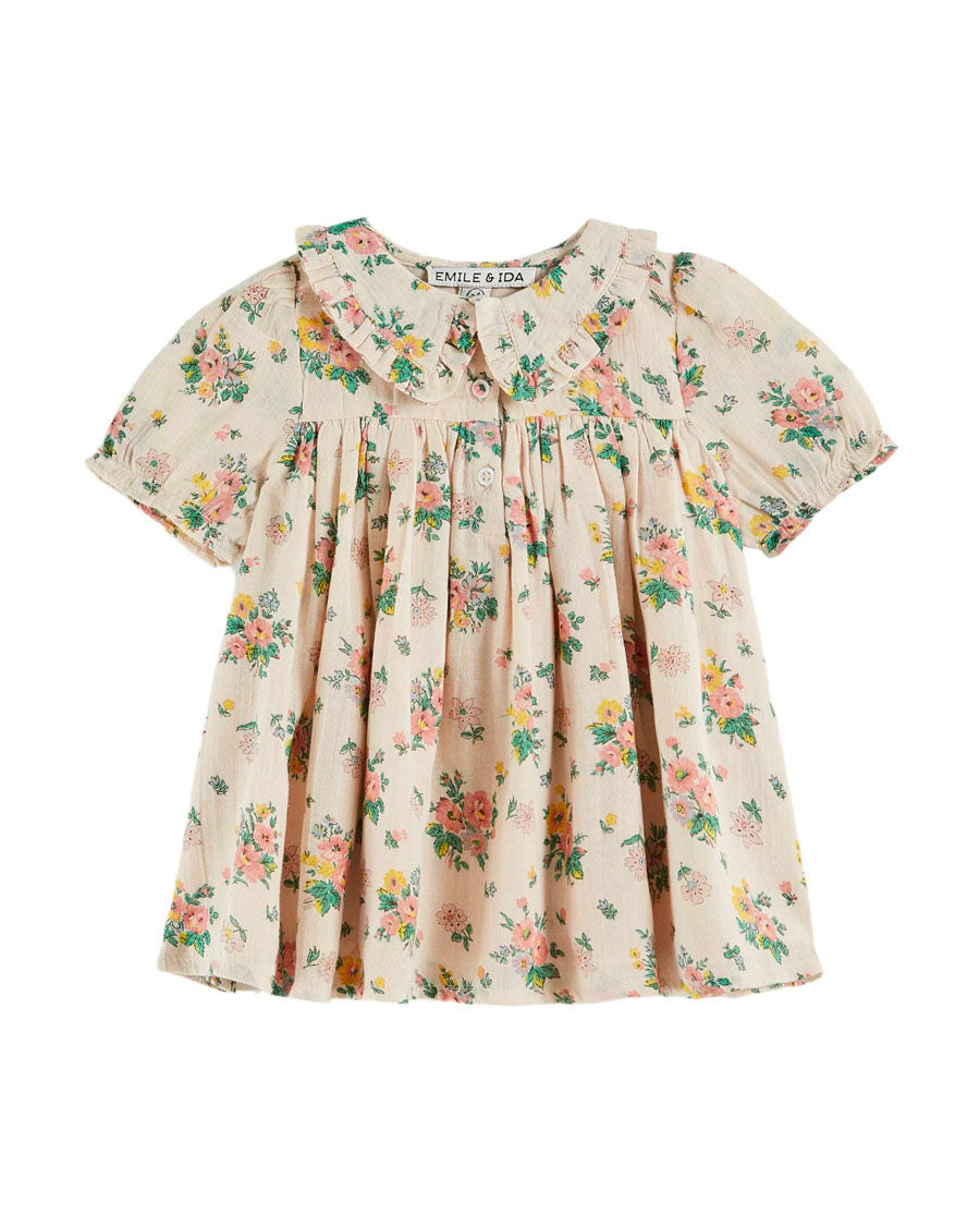 Short dress in powder-beige cotton dotted with bouquets of flowers.