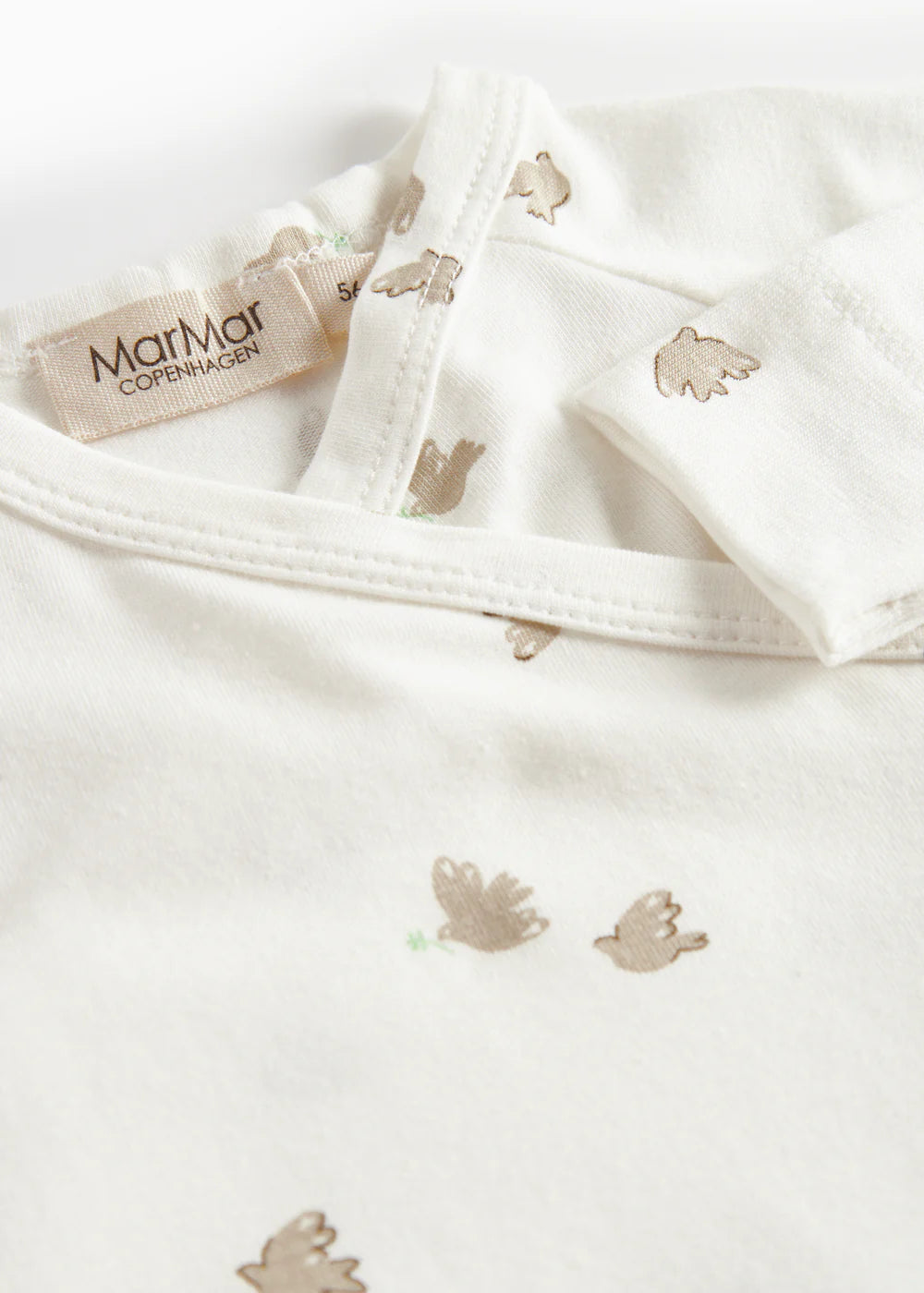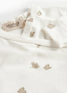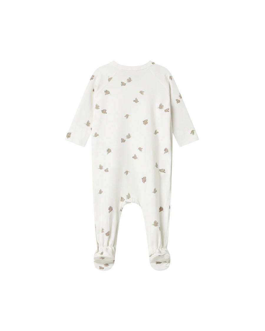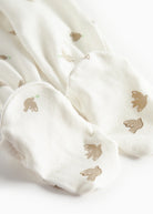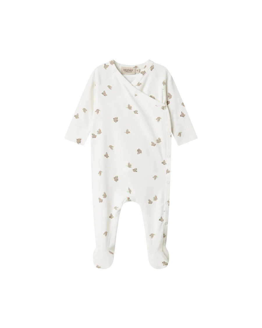Long-sleeved jumpsuit with feet for newborns. The jumpsuit has a wrap-around closure and closes with snaps from the neck and down one leg. The jumpsuit has a nice print and is soft, stretchy and comfortable to wear.