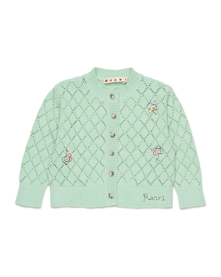 Cardigan made of 100% cotton with openwork diamond pattern and floral embroidery. A model with original style and carefully crafted details.