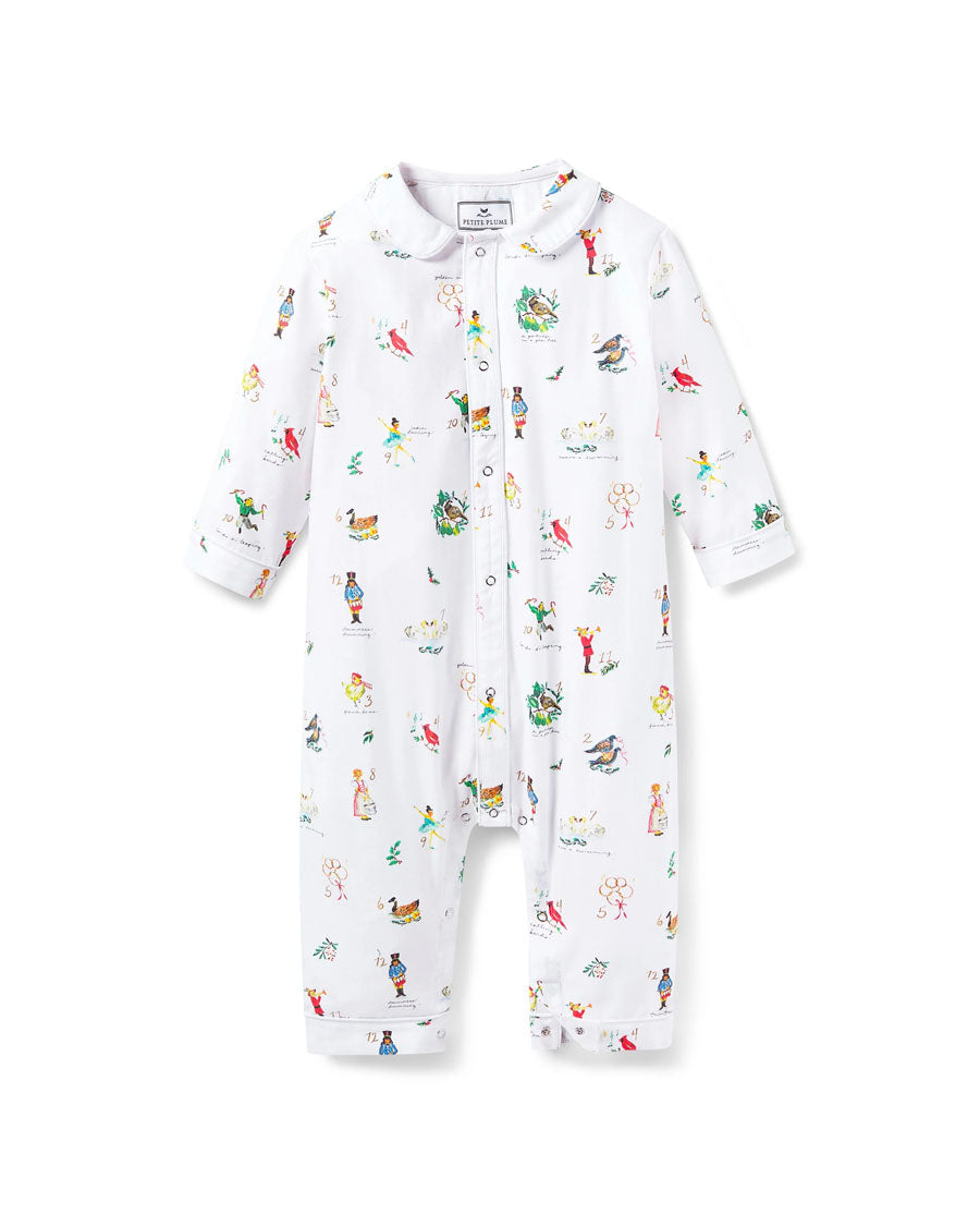 Celebrate each of the 12 days of Christmas with this lighthearted new holiday design. You'll hear the cheerful tune as you spot drumming drummers, swimming swans, golden rings, and more. Our Romper is made of the softest twill which will allow your little one to walk, crawl, or relax in comfort.