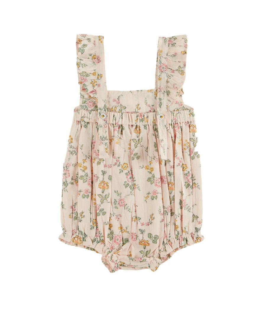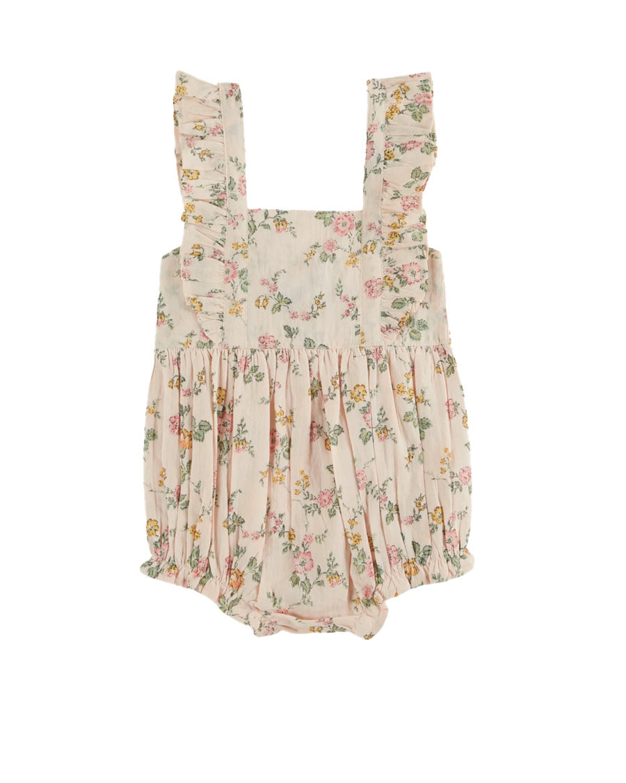 Combibloomer in pink cream organic cotton voile with a print of roses and carnations inspired by a vintage pattern. A light and delicate piece which borrows as much from the combibloomer as from the overalls with ruffled straps which create a bib on the bodice.