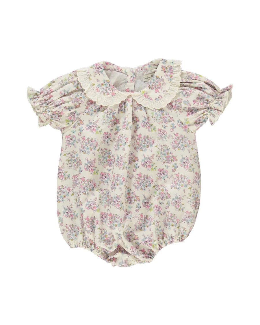 Inspired by vintage childhood memories. The nostalgic fleur print Ruby romper is a heritage style that we are so proud to present this new season. Crafted from soft cotton this balloon fit romper features short puff sleeves, adorable collar with lace finishing and back closure with mother of pearl buttons. Snaps between legs for easy change. Truly beautiful silhouette.