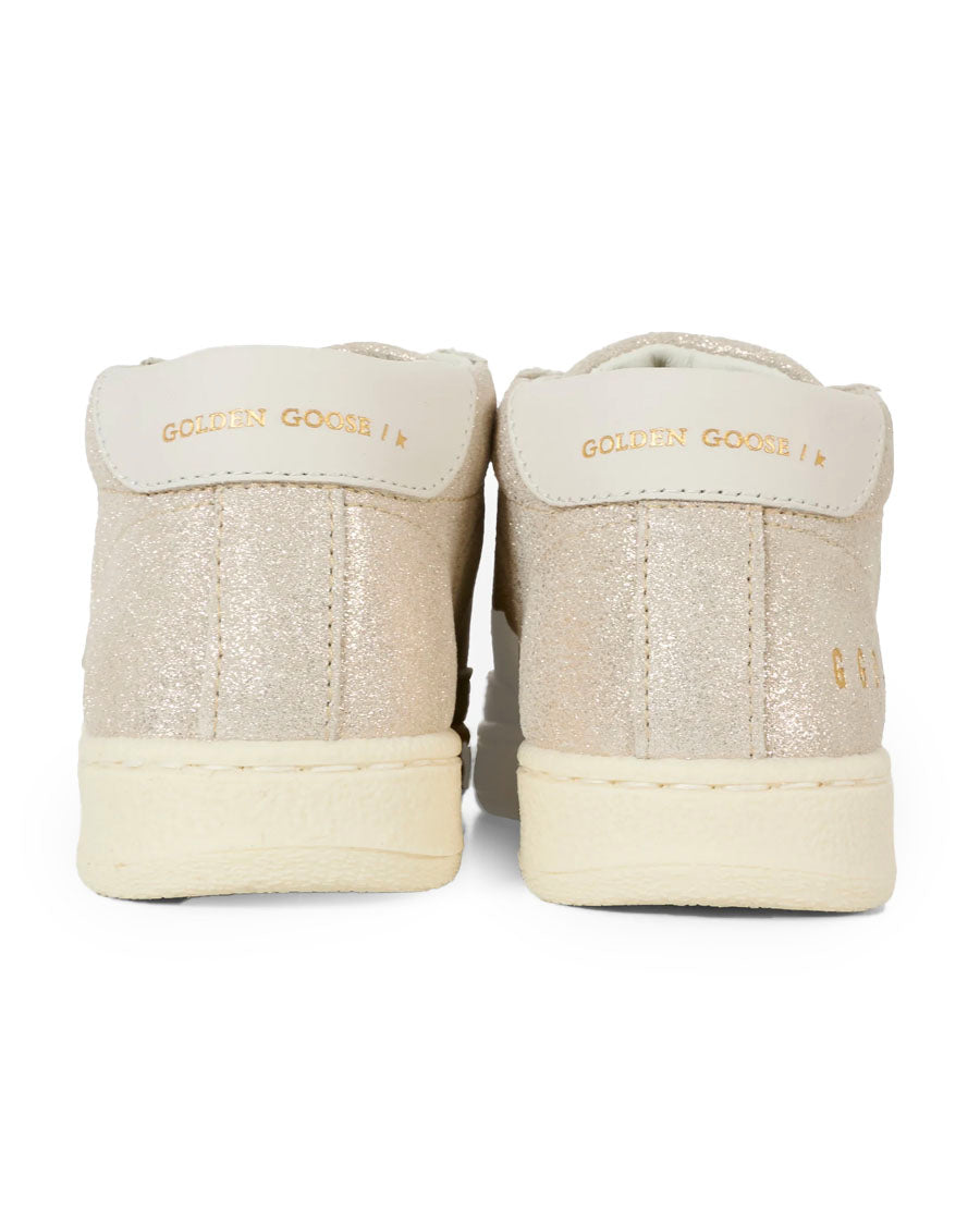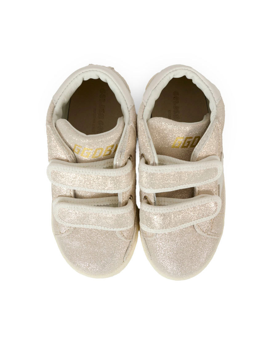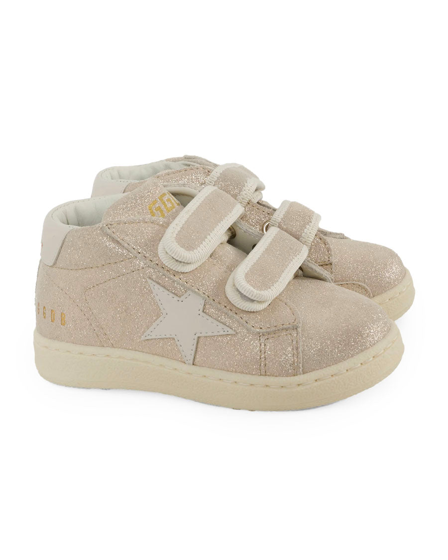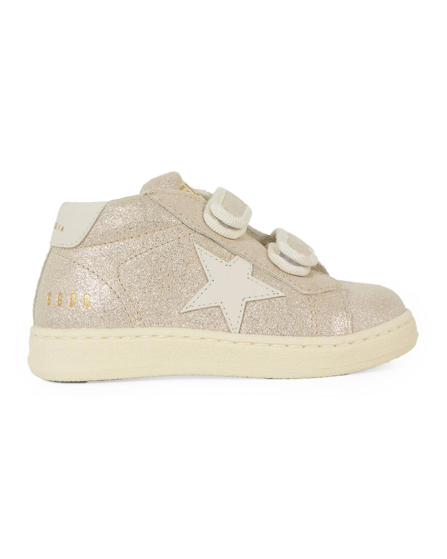 Beige trainers with rubber sole, glitter upper, two straps with strap fastening at the front and round toe. They are embellished with a white star and logo. Made in Italy.