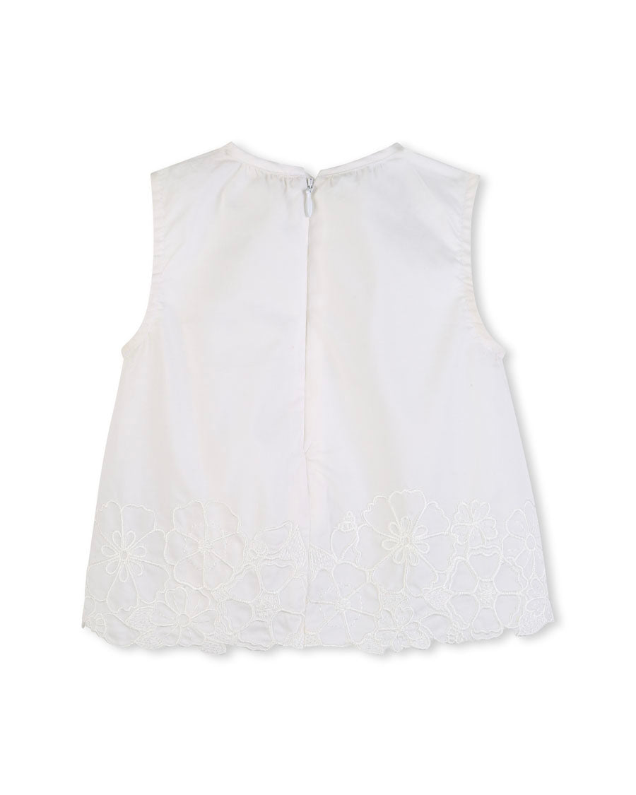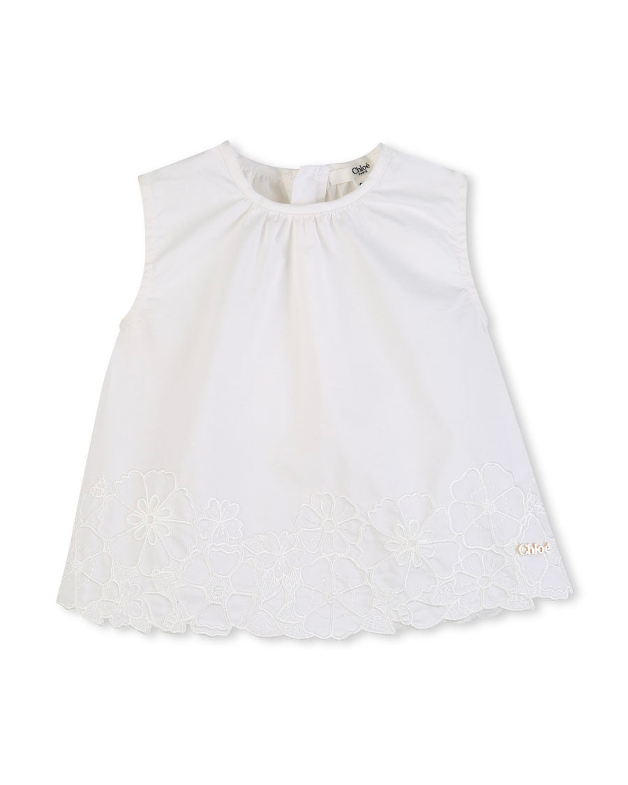 Awaken your child's style with this lovely sleeveless top from CHLOÉ. Made of poplin containing organically grown cotton, it offers unparalleled softness. Delicate floral embroidery adds a touch of elegance, while the back zipper makes it easy to put on. With its gold metal plate, this garment combines chic and comfort. Give him the best of ethical and refined style!
