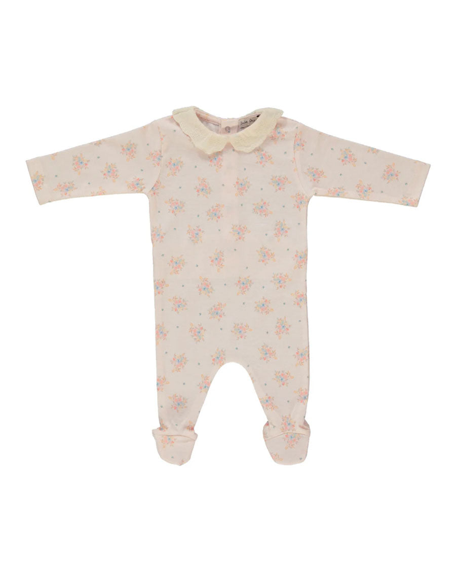 Lovely Marie collar overall in softest and comfiest organic cotton in signature floral print. Features an adorable cotton lace collar, long sleeves, covered toes and snaps on the back. This overall is the ultimate item for all babies and especially for newborns. Match it with a Marie bonnet and blanket for a perfect set.