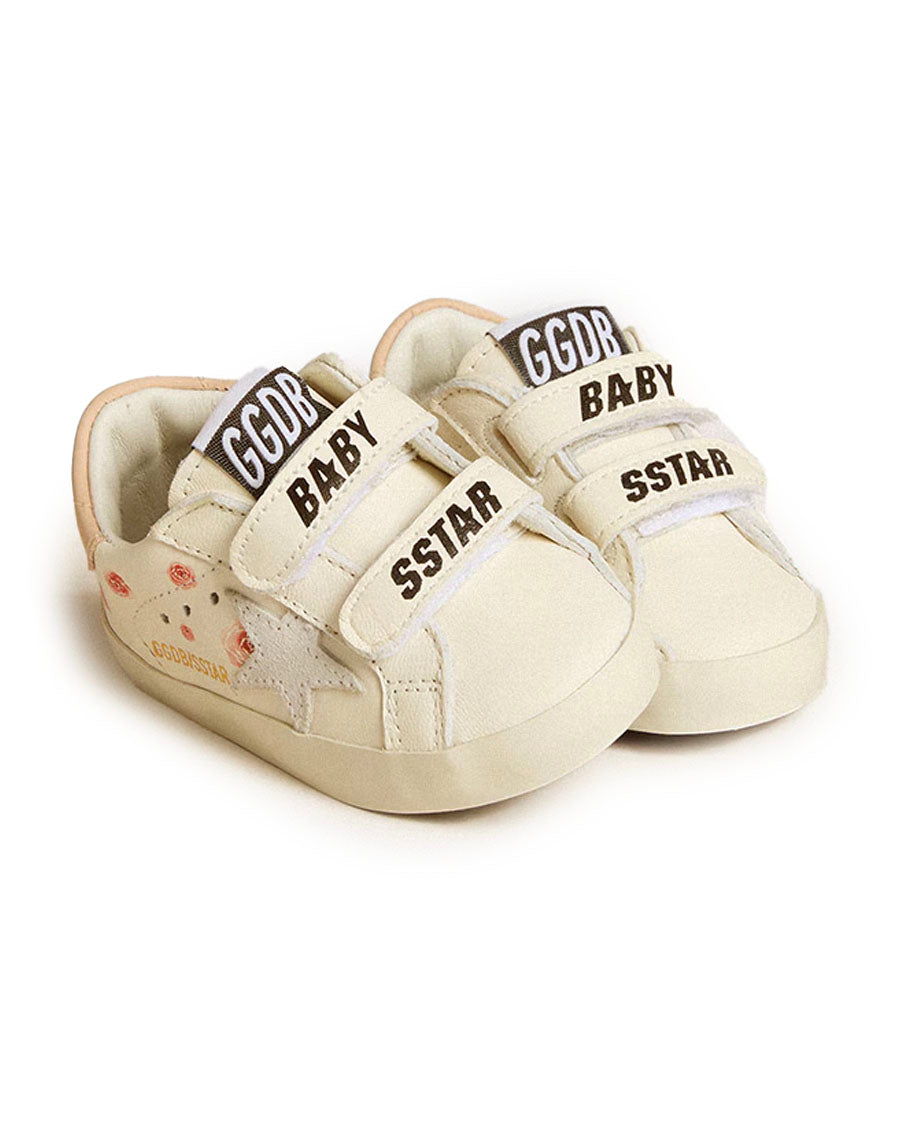 The Baby version of our Old School sneakers features two Velcro straps on the front with contrasting logo. With a white nappa leather upper with pink rose motif, this model features a white suede star and beige leather heel tab. The white suede insert on the back completes the look.