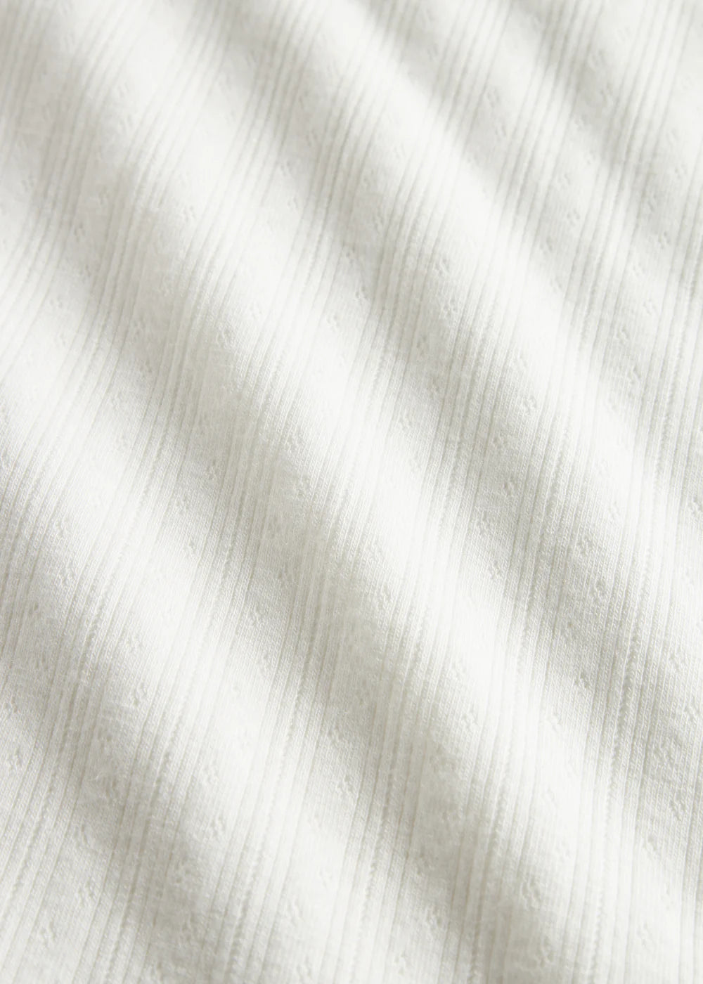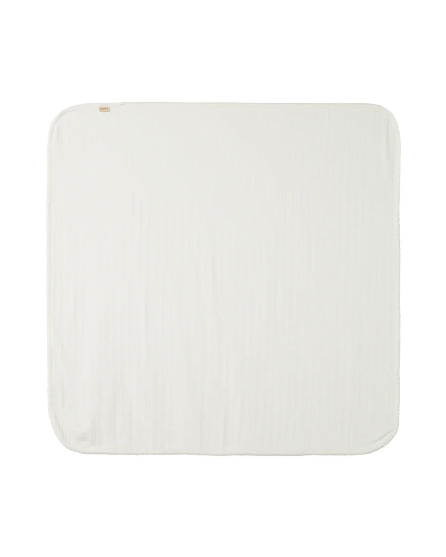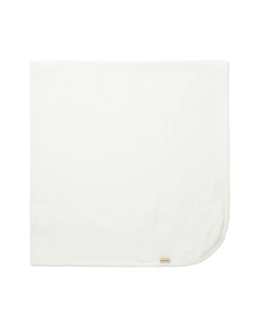 Baby pointelle blanket with rounded corners and picot edges. The blanket measures 80 x 80 cm. The blanket is soft, stretchy and comfortable to wear.