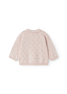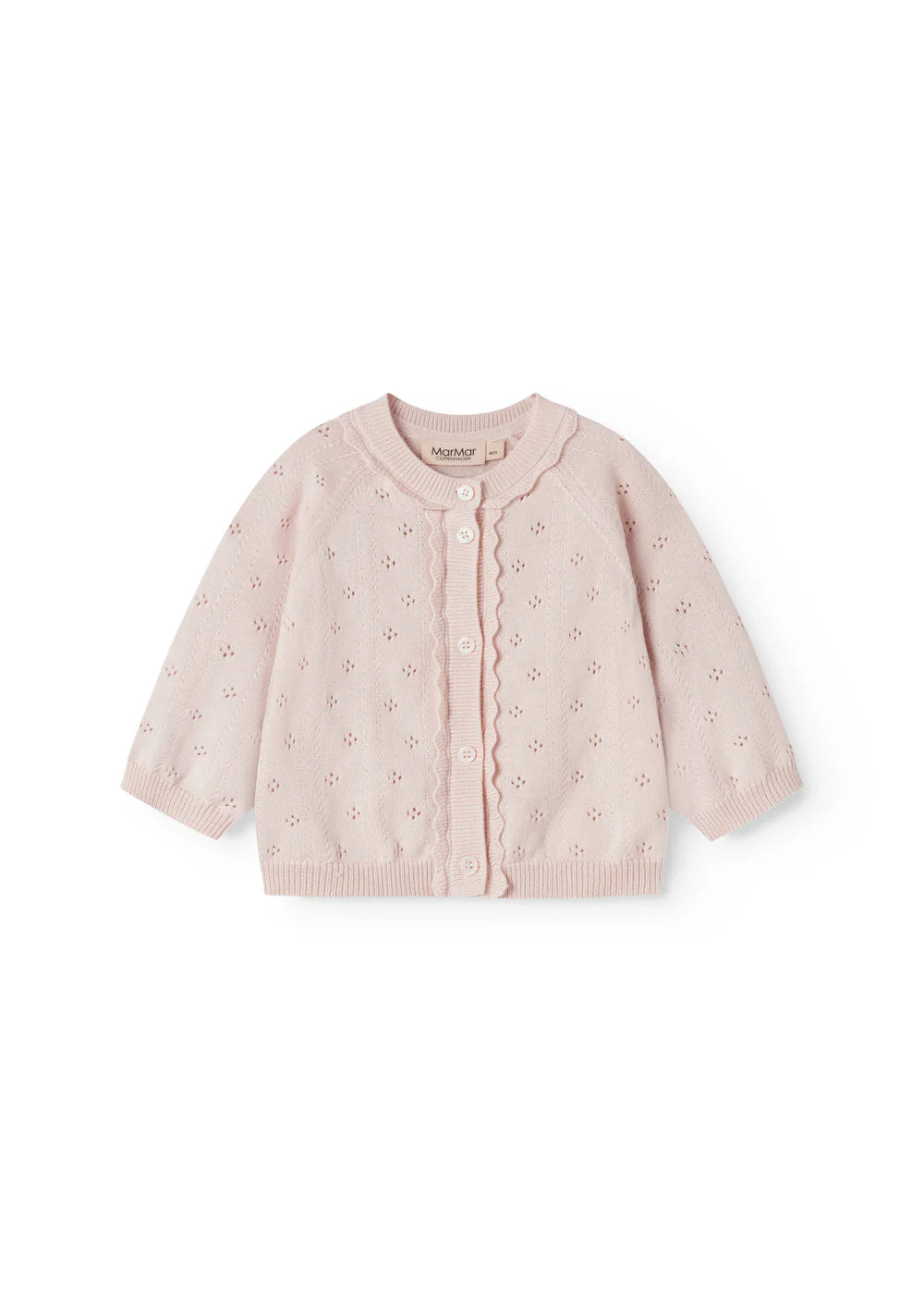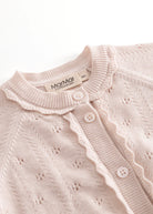 Knit cardigan for the little ones with a fine lace pattern and a wavy edge along the button closure. The cardigan has a round neck, raglan sleeves and ribbed edges at the sleeves and bottom.