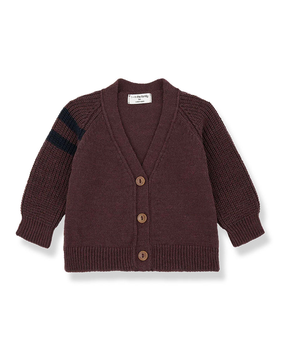 Heirloom cardigan sweater with rugby striped detail on the sleeve.