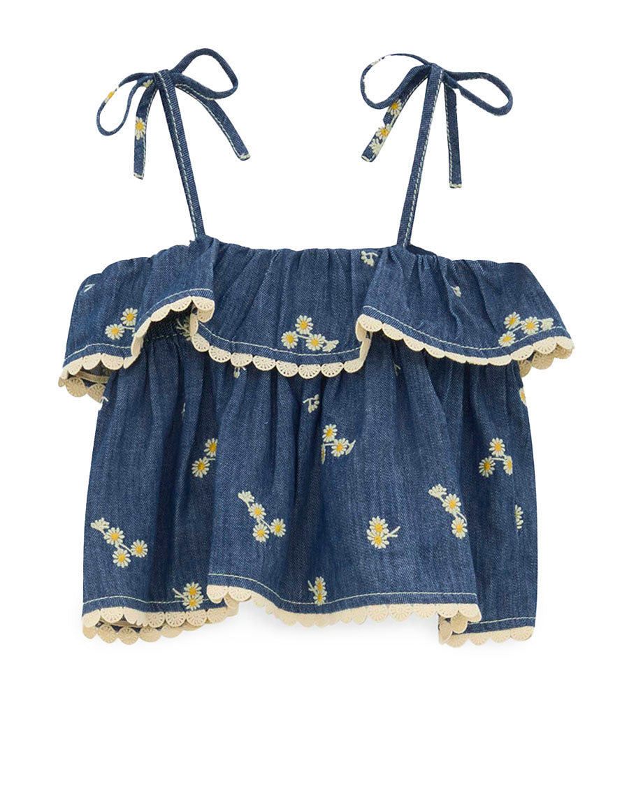 The Lucky Kids Denim Top in Daisy from our Summer Swim 2025 Collection. A kids cotton top featuring a playful frill neckline, scalloped edges and shoulder straps with fixed bows.