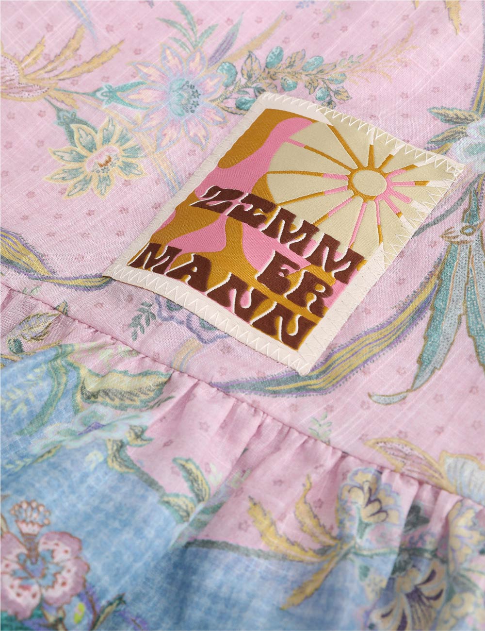 The Indra Kids Flutter Dress in Lilac Scarf Floral from our Summer Swim 2026 Collection. A kids cotton dress featuring a shirred square neckline, frill sleeve detailing and a flared skirt.