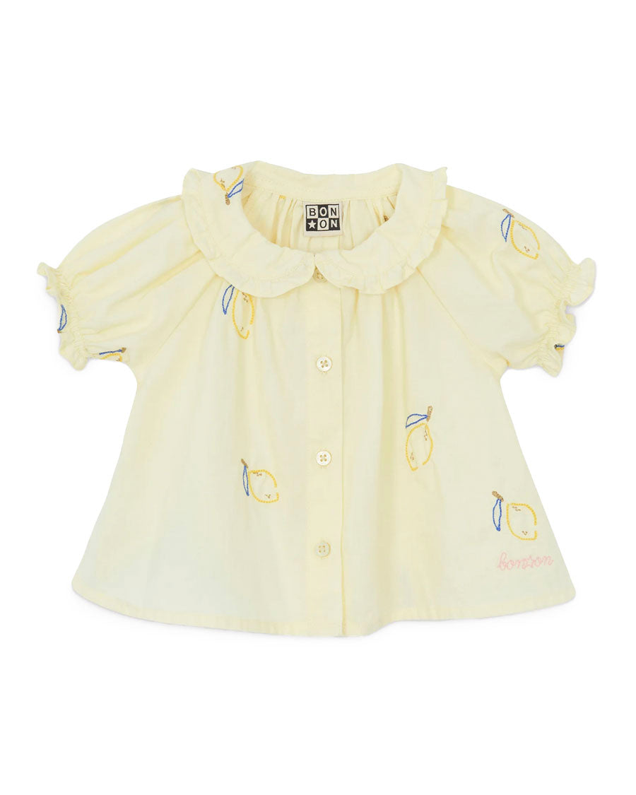 There Blouse Aria in a "Limoncello" shade comes from the "Dolce Vita" collection, is a celebration of soft colors and the joy of life. She has a vintage little air with her Peter pan collar And its cut inspired by retro silhouettes. Made in a light and pleasant fabric, this Blouse is perfect for strolling in summer! We love her Print with small tangy yellow lemons and its touch of Blue Crazy that makes your outfits stylish.