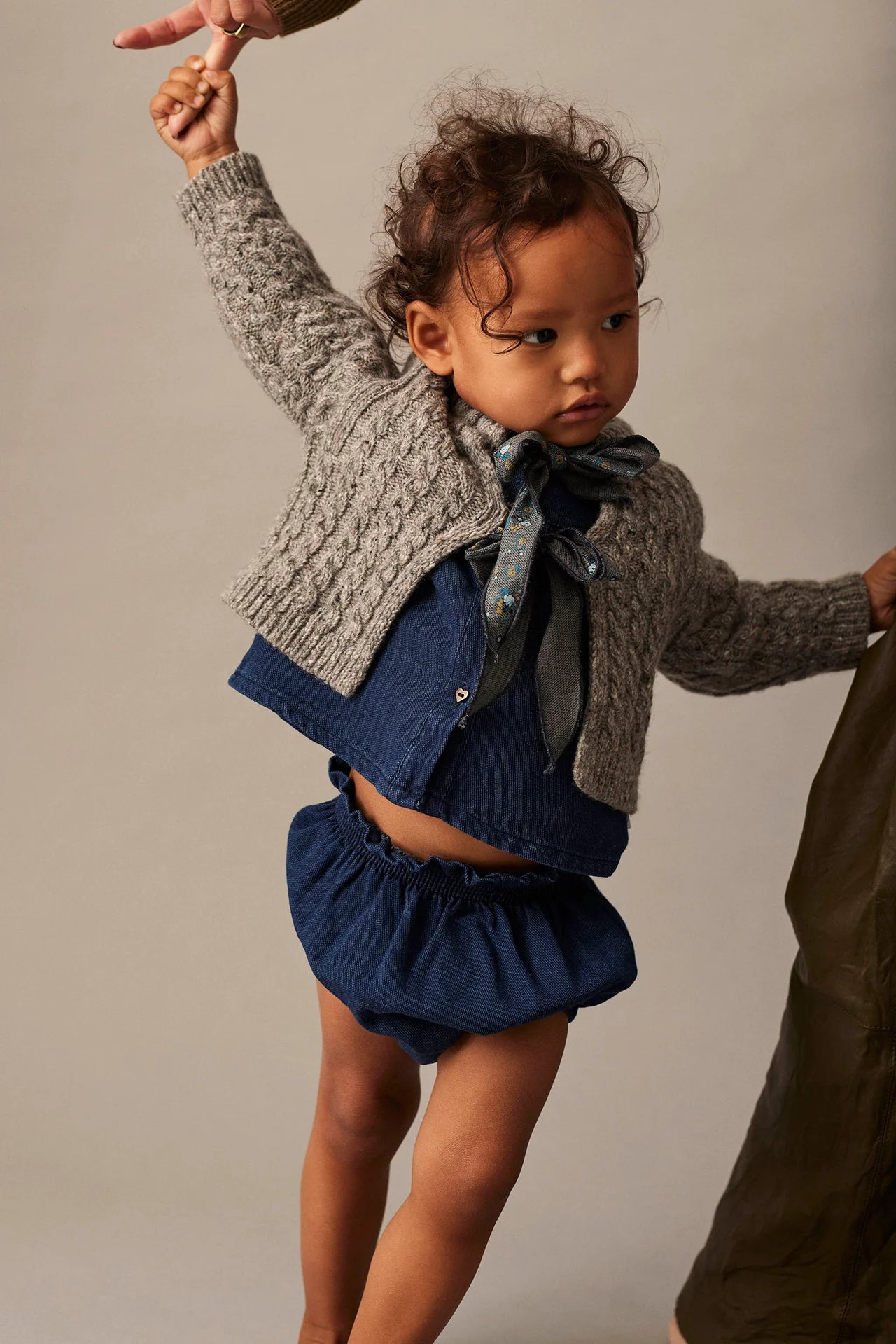 Baby girl cardigan made from a soft, fluffy wool and recycled polyamide cable-knit tricot. It features a rounded neckline, ribbed neck, cuffs, and hem. Front ties with bows in floral-print flannel fabric. Subtly speckled for a gentle look. Part of our recycled baby clothes collection.