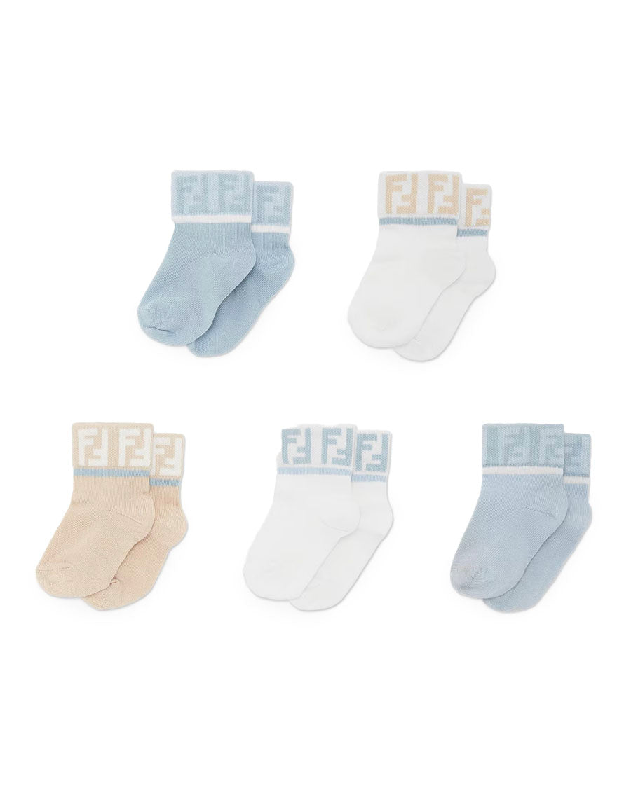 Set of multicolor cotton baby socks with beige and light blue FF logo detail at the ankle.