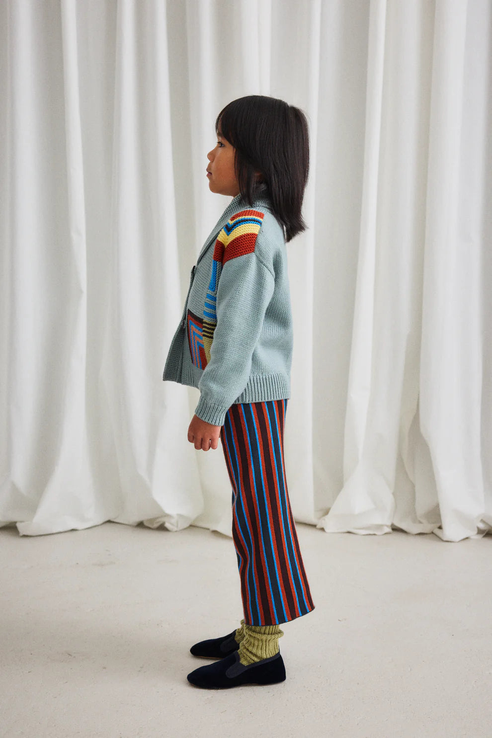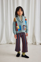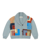 A patchwork cardigan in Merino wool, featuring hand-knit multi-color mitered squares designs, a shawl collar, ribbed cuffs and hem, and a horn button closure.
