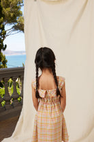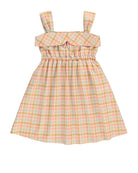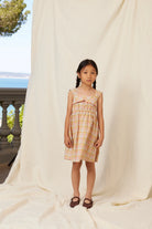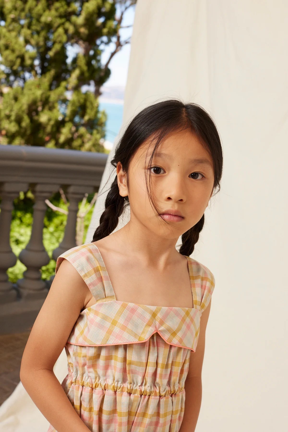 Simply adorable Camille strap dress in beautiful, pink-toned checked cotton is a perfect dress for warm-weather outings. It is to be worn on its own or over a t-shirt or blouse. Wide straps and a roomy skirt are added for ultimate comfort.