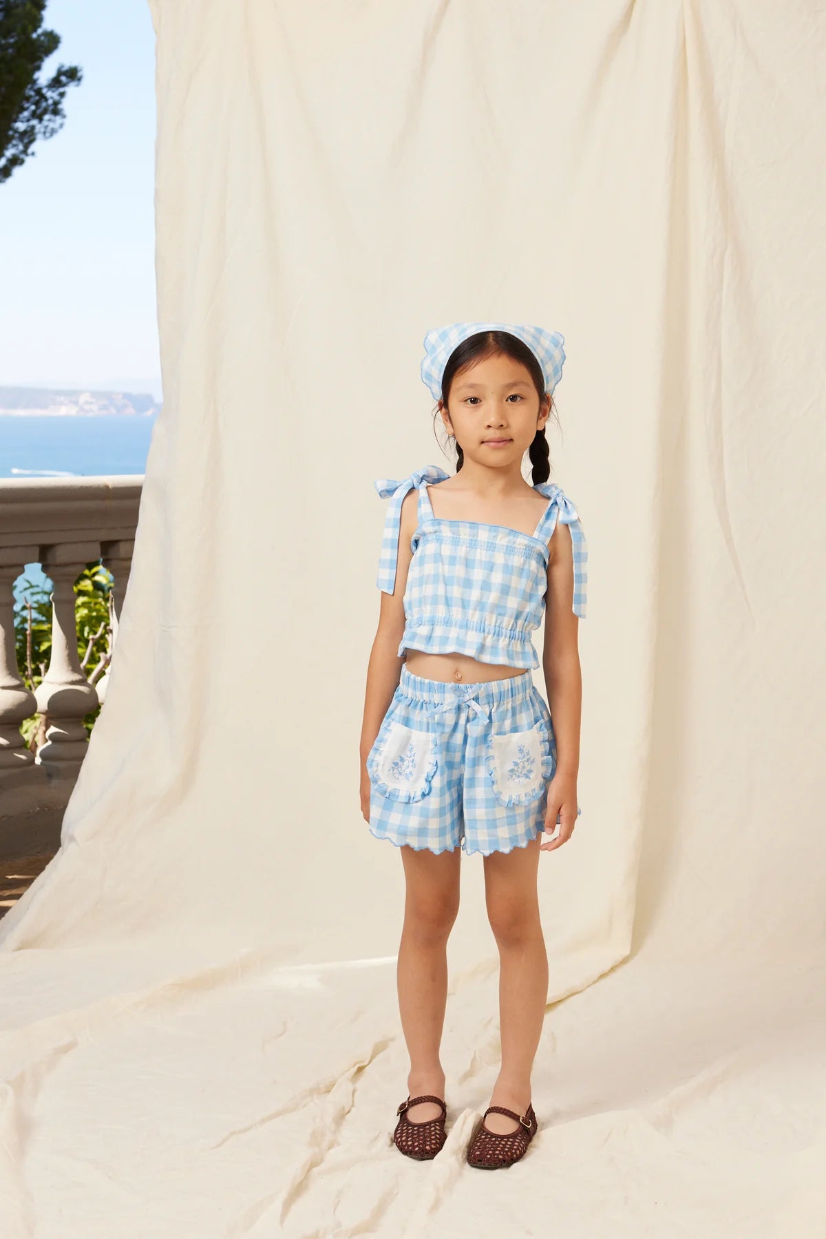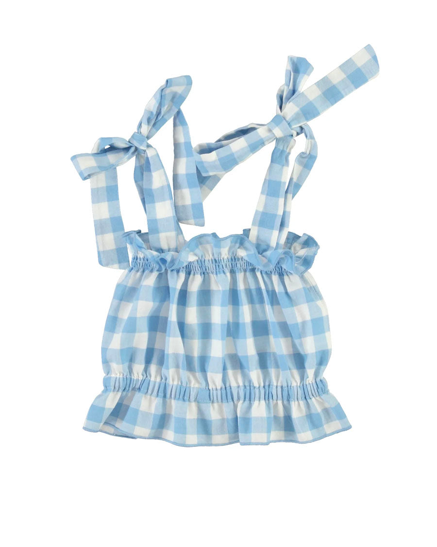 Simple yet adorable Viola smocked top is a perfect style for the spring/summer season ahead. Crafted from the softest cotton in an elegant sailor gingham print, this top features a comfortable fit and playful bow ties on the shoulders. Wonderful match with Viola shorts.