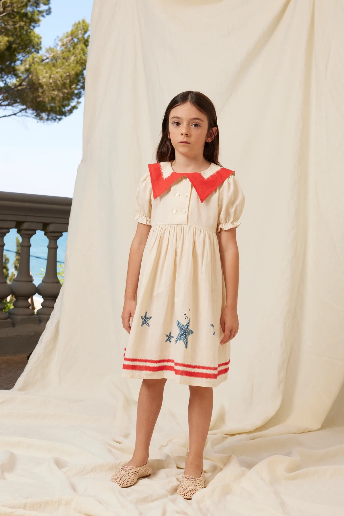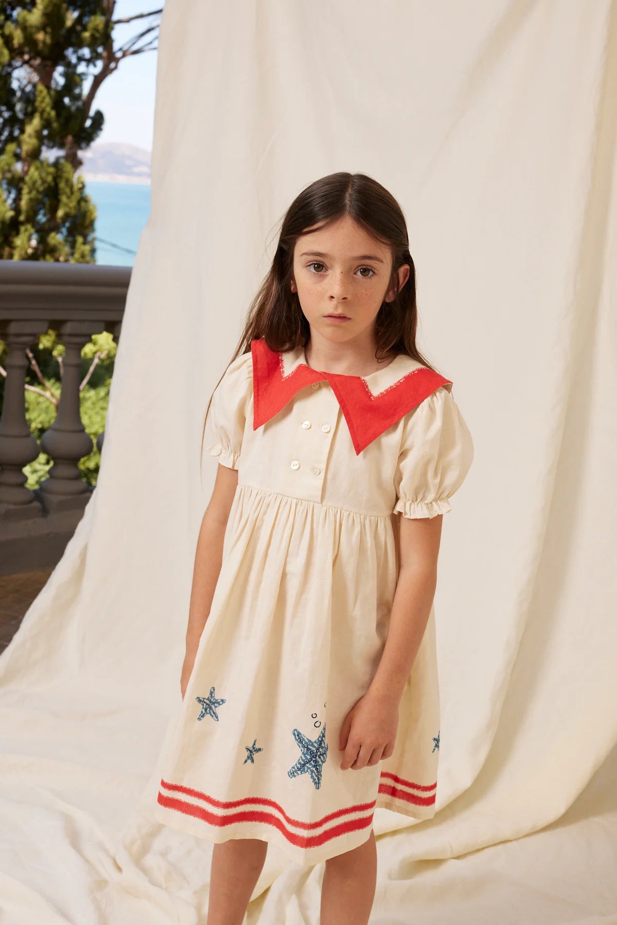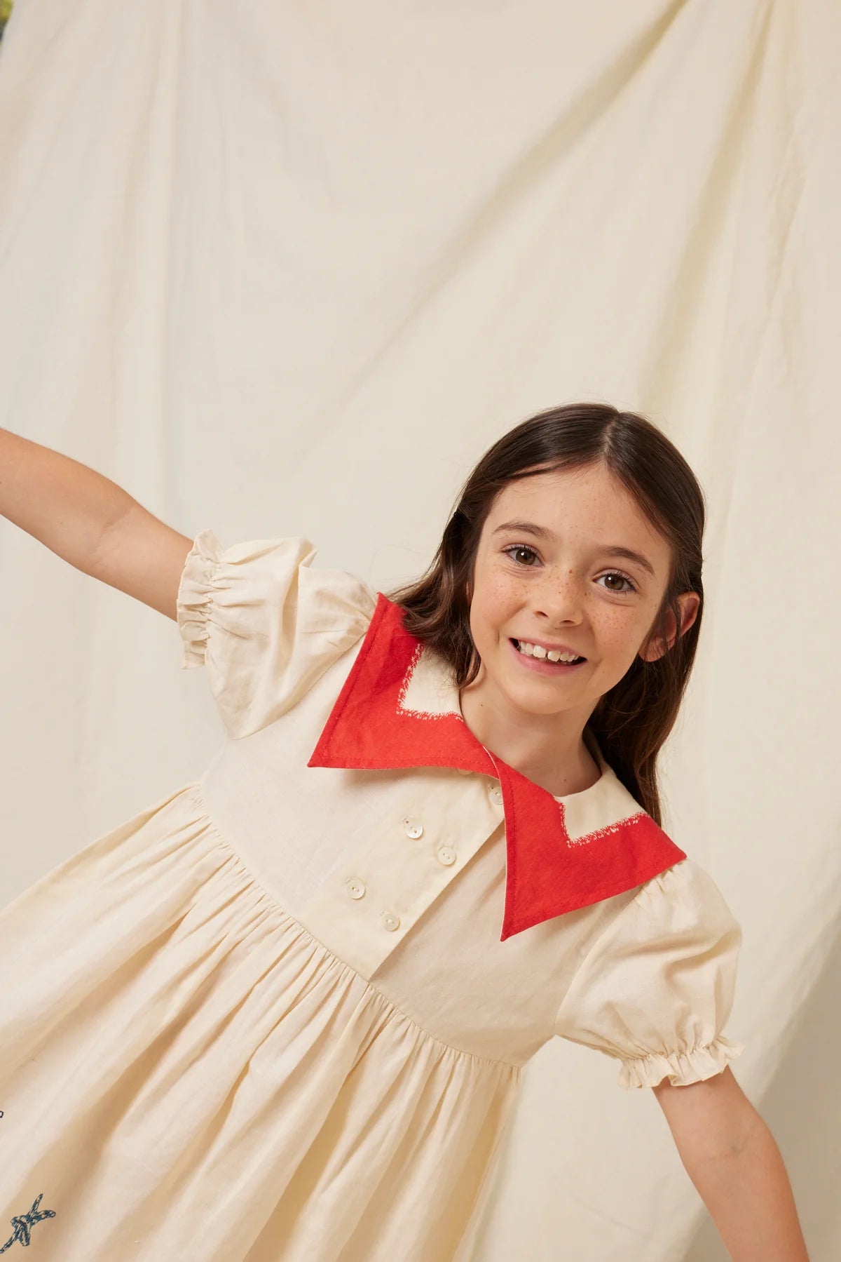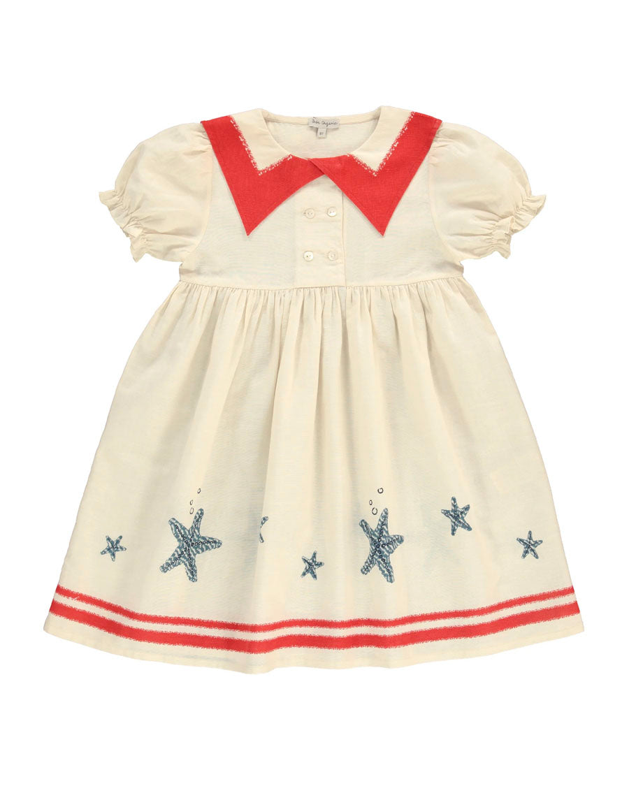 Adorable sailor-style Pearl dress in signature vintage-style cotton and linen blend fabric. Dress features a classical pointed collar, puff sleeves with elasticated gathering, and a roomy skirt perfect for twirling.