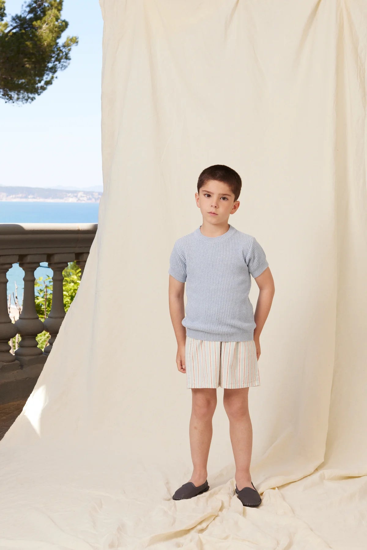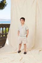 Softest cotton fabric Sebastien shorts in an elegant stripe pattern. Shorts feature a comfortable loose fit, two side pockets, and an elasticated waist. Perfect to combine with the Mathias shirt for a total look.