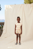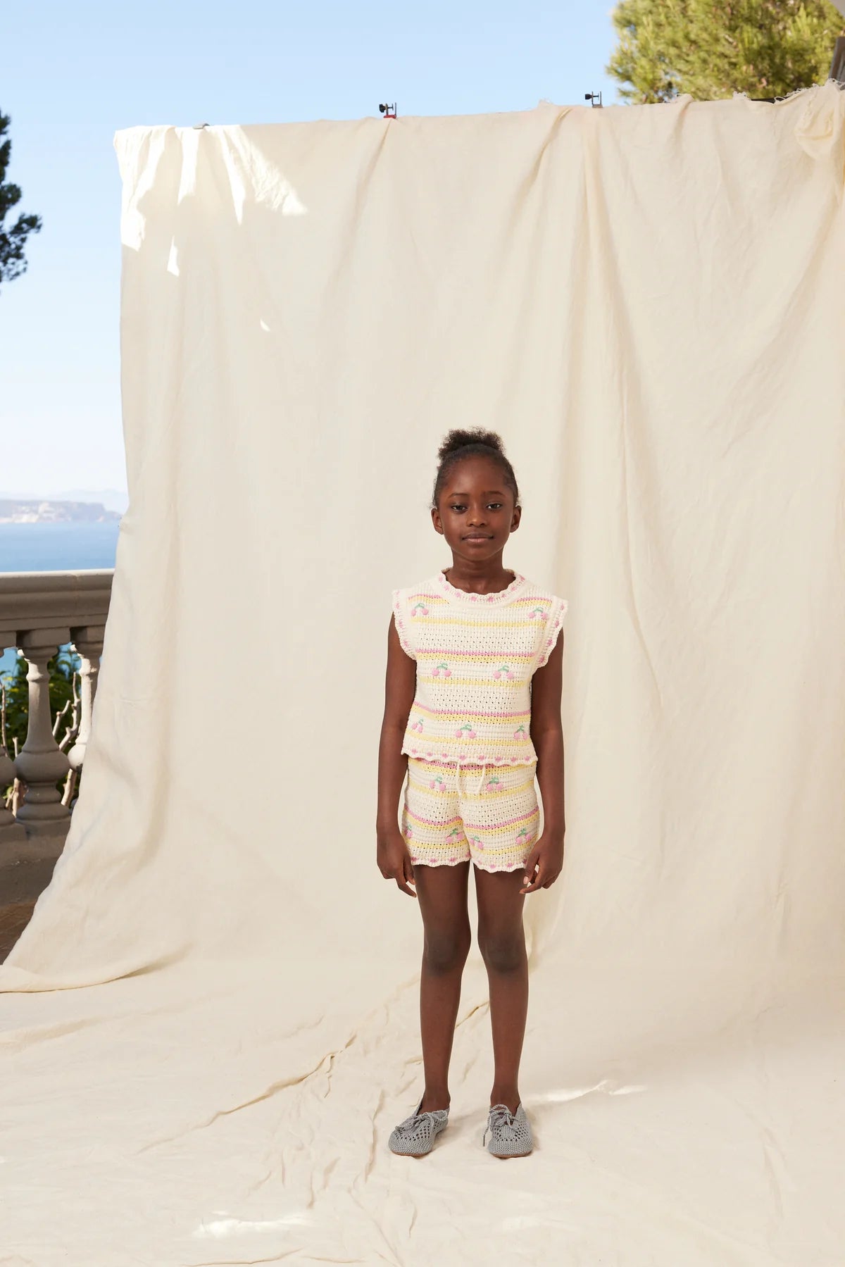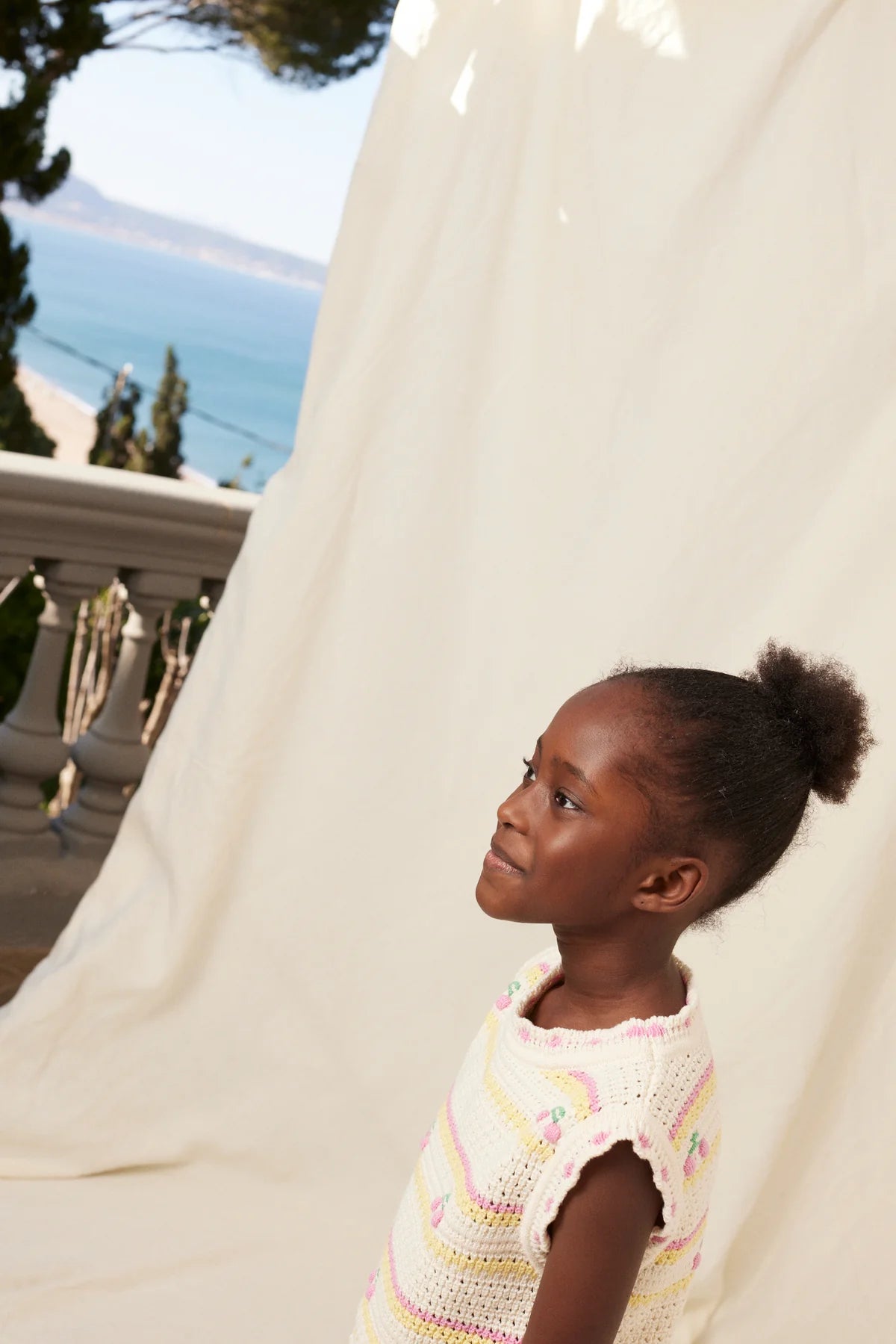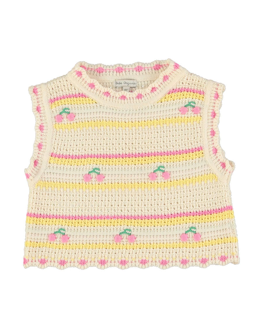Knit of our dreams! Bebe Organic signature crochet style knitwear inspired by bohemian beach holidays. Paloma vest in crochet knit with cherry motif made of organic cotton yarn is an easy and favorite style for upcoming summer days. Features a sleeveless silhouette and loose fit. Perfect match with Paloma shorts.