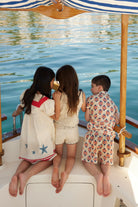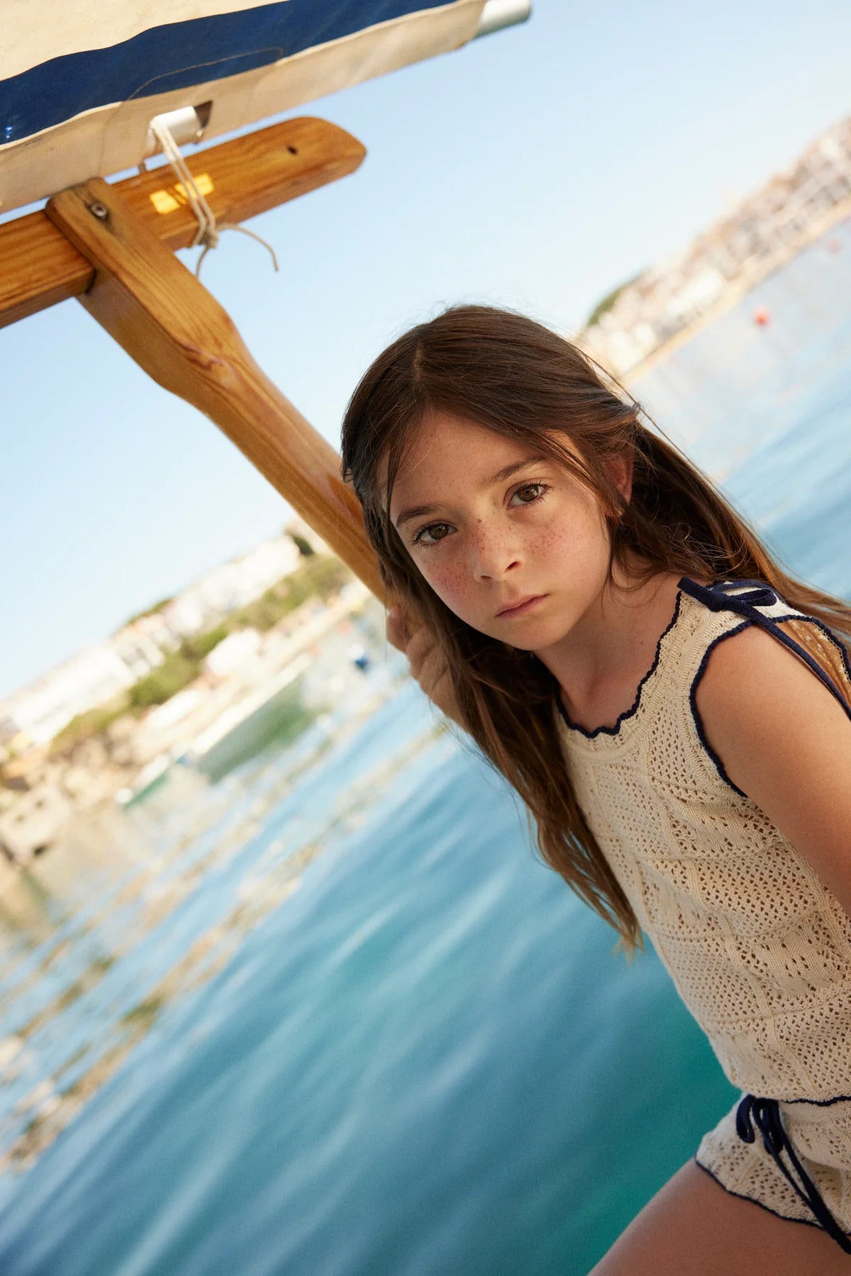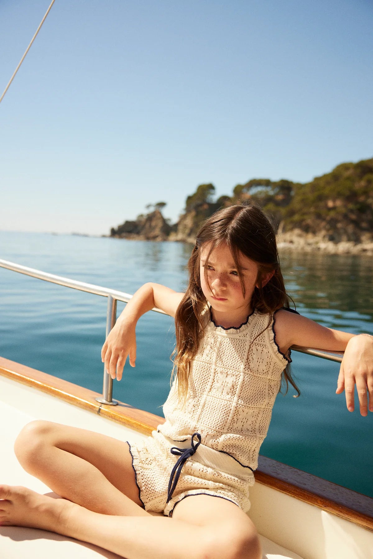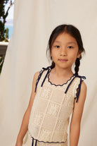 Knit of our dreams! Bebe Organic signature crochet style knitwear inspired by bohemian seaside holidays. Elina shorts in crochet knit with lovely detailing made of 100% cotton yarn. These must-have shorts are effortlessly charming and gentle on the skin. Features a gently elasticated waistline, contrasting dark-blue lace, and a drawstring. Perfect match with the Elina top.