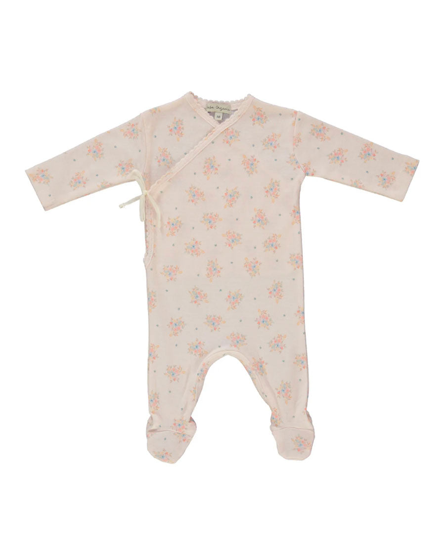Marie wrap overall in the softest organic cotton features a beautiful floral print, a wrap opening, and long sleeves and legs and covered toes. Snaps for an easy change. This overall is the ultimate item for all babies and more especially for newborns. Match it with a Marie bonnet for a perfect set.