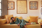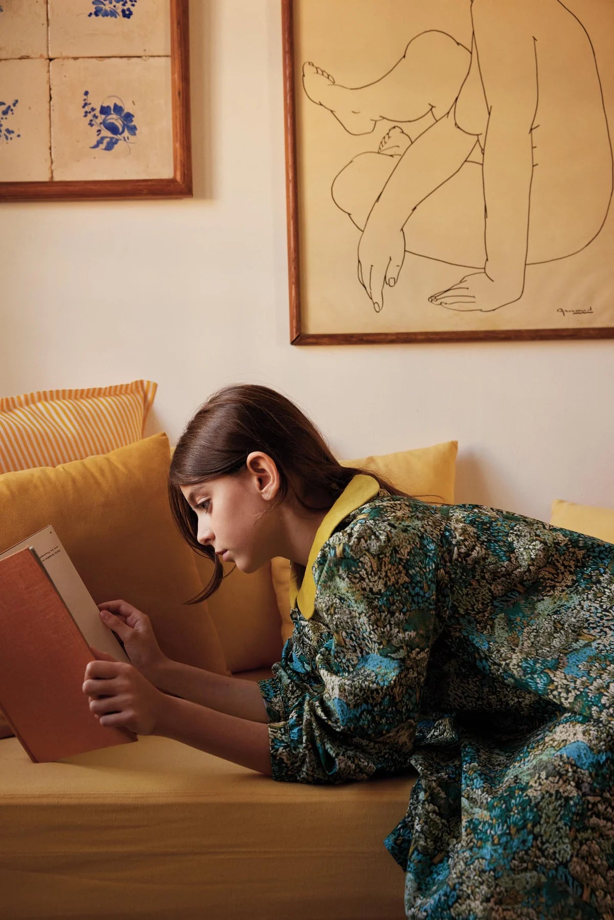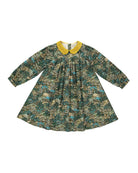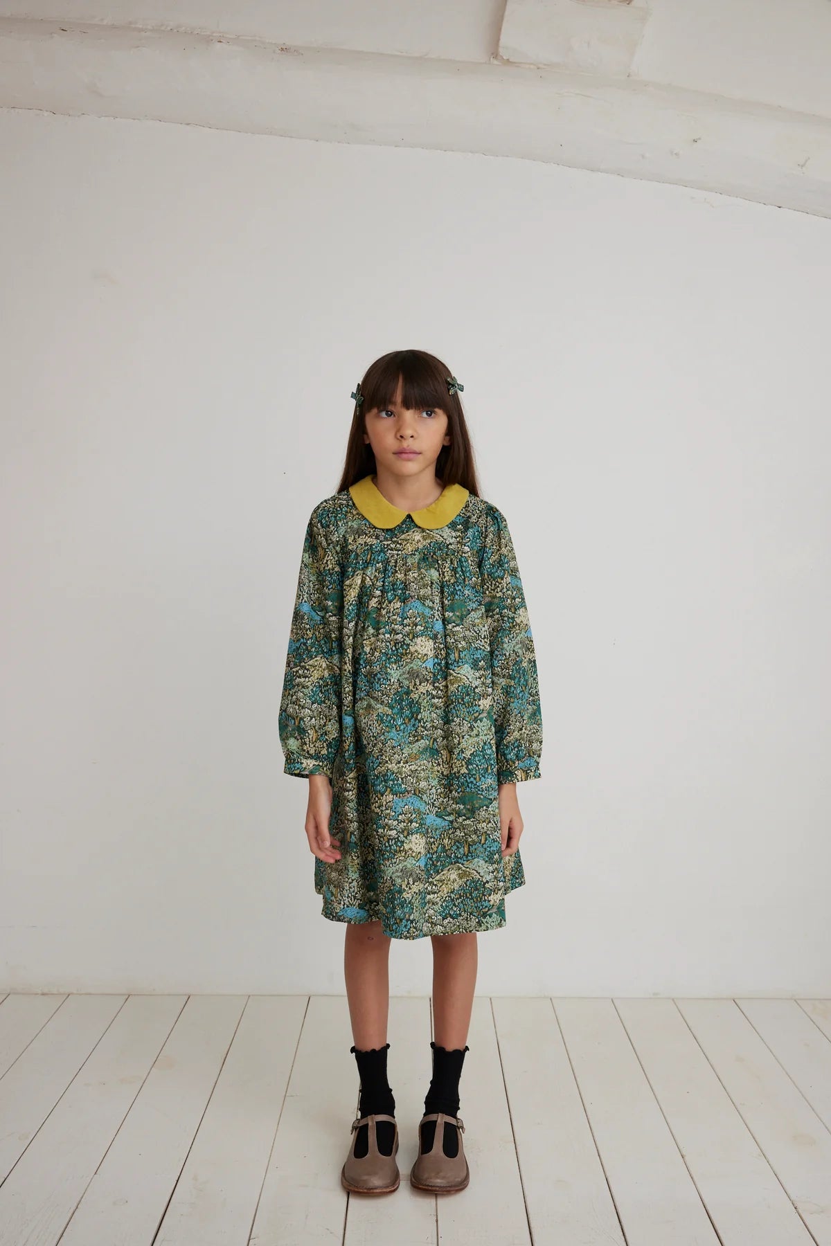 The dress is made of the comfiest cotton fabric with magic forest print in green, blue, and mustard tones. Beautiful timeless Nola dress features a contrast velour collar, elegant long sleeves and mother-of-pearl buttons on the back. This dress will inject a pop of colour into your winter wardrobe.