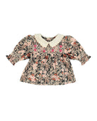 Inspired by the sweetest childhood memories, the Elora baby blouse – a timeless piece full of charm. Crafted from 100% organic cotton, this blouse is designed for both comfort and elegance. It features a romantic floral print with beautifully hand-made floral embroideries on the chest, a classic Peter Pan collar, and long puff sleeves with smocked cuffs. Perfect for everyday wear or special occasions.