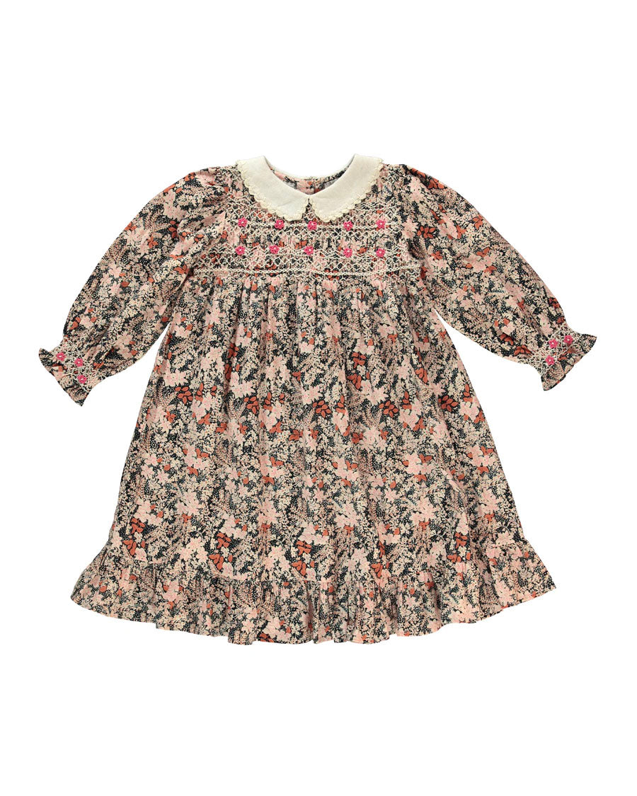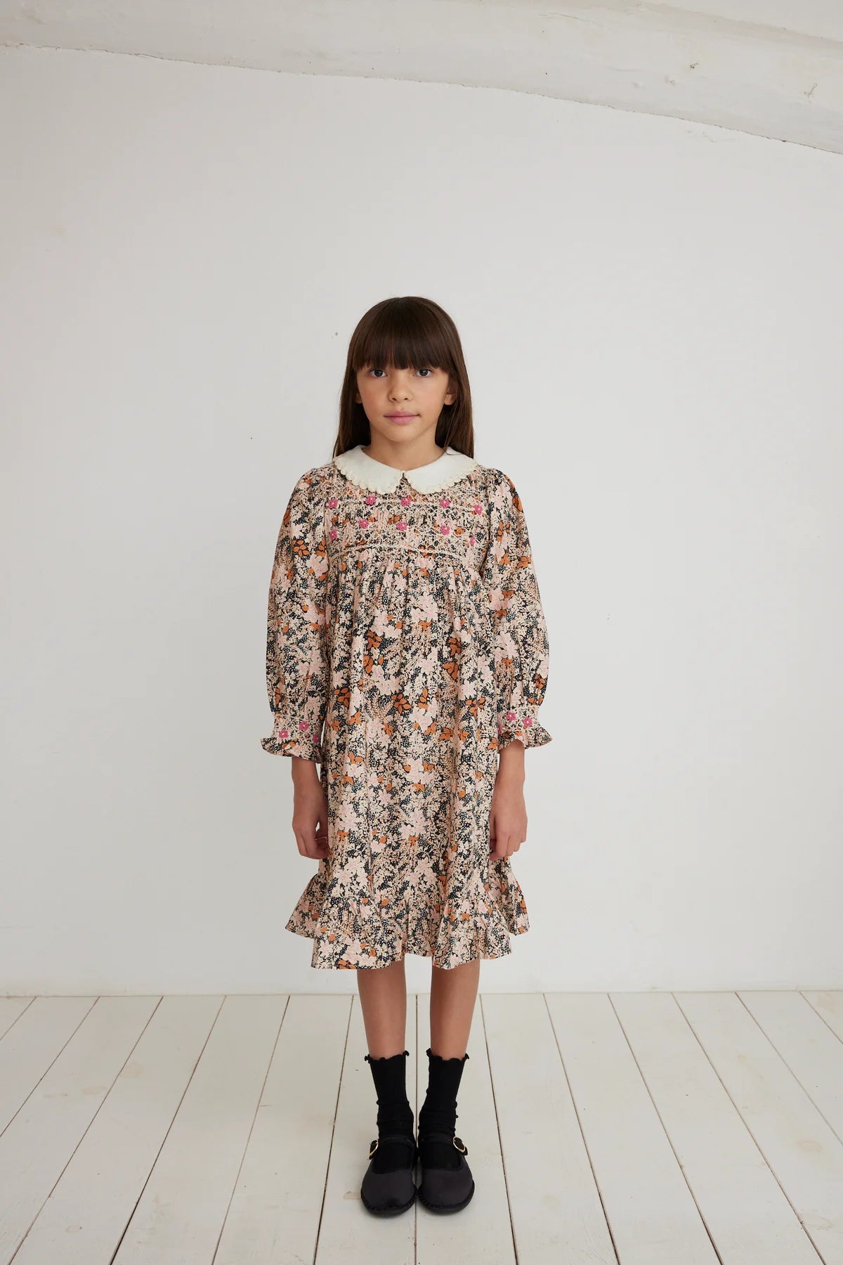 Crafted from 100% organic cotton, this dress is designed for both comfort and elegance. It features a romantic floral print with beautifully hand-made floral embroideries on the chest, a classic Peter Pan collar, ruffles on the hemline, and long puff sleeves with smocked cuffs. As usual, a flouncy skirt- perfect for twirling. Perfect for everyday wear or special occasions.