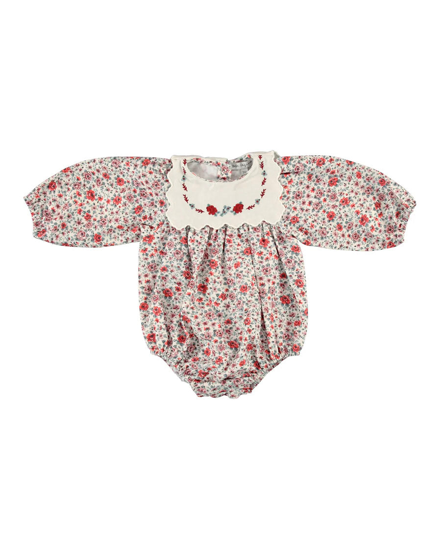 Vintage-inspired Clementine romper in nostalgic red floral print features a comfortable balloon fit, vintage-inspired square bib collar with signature floral embroidery, and long puff sleeves. Crafted from the softest organic cotton. Closes with mother-of-pearl buttons in the back and snaps between legs for easy change.
